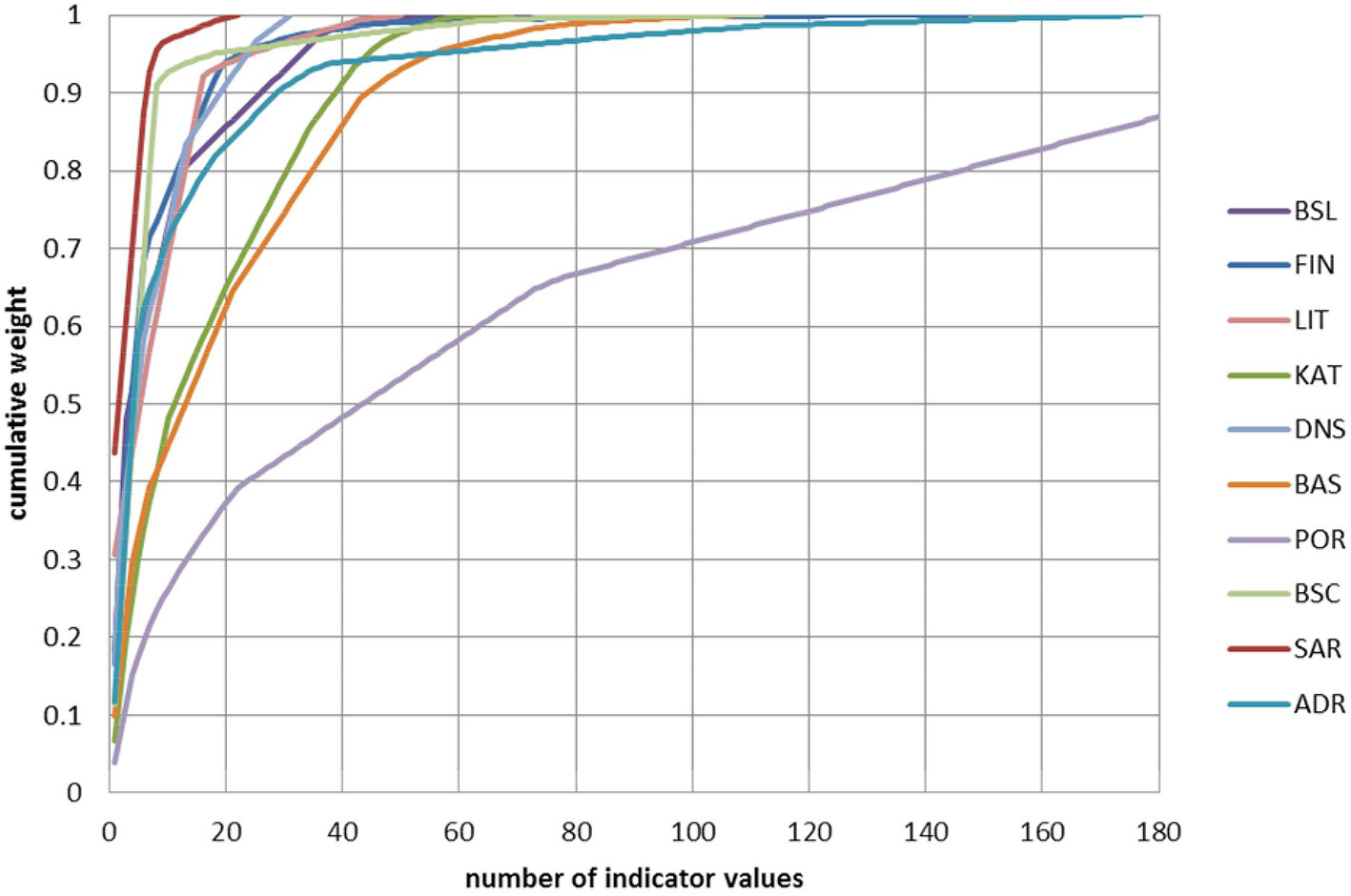 Cumulative contribution to the final assessment (cumulative weight) in relation to the number of indicator values. For each case study, values have been ranked from the most important indicator value (highest weight) to the least important value (lowest weight). The X-axis has been cut; Portuguese case study has a total of 466 indicator values. For case study codes, see Table 1.