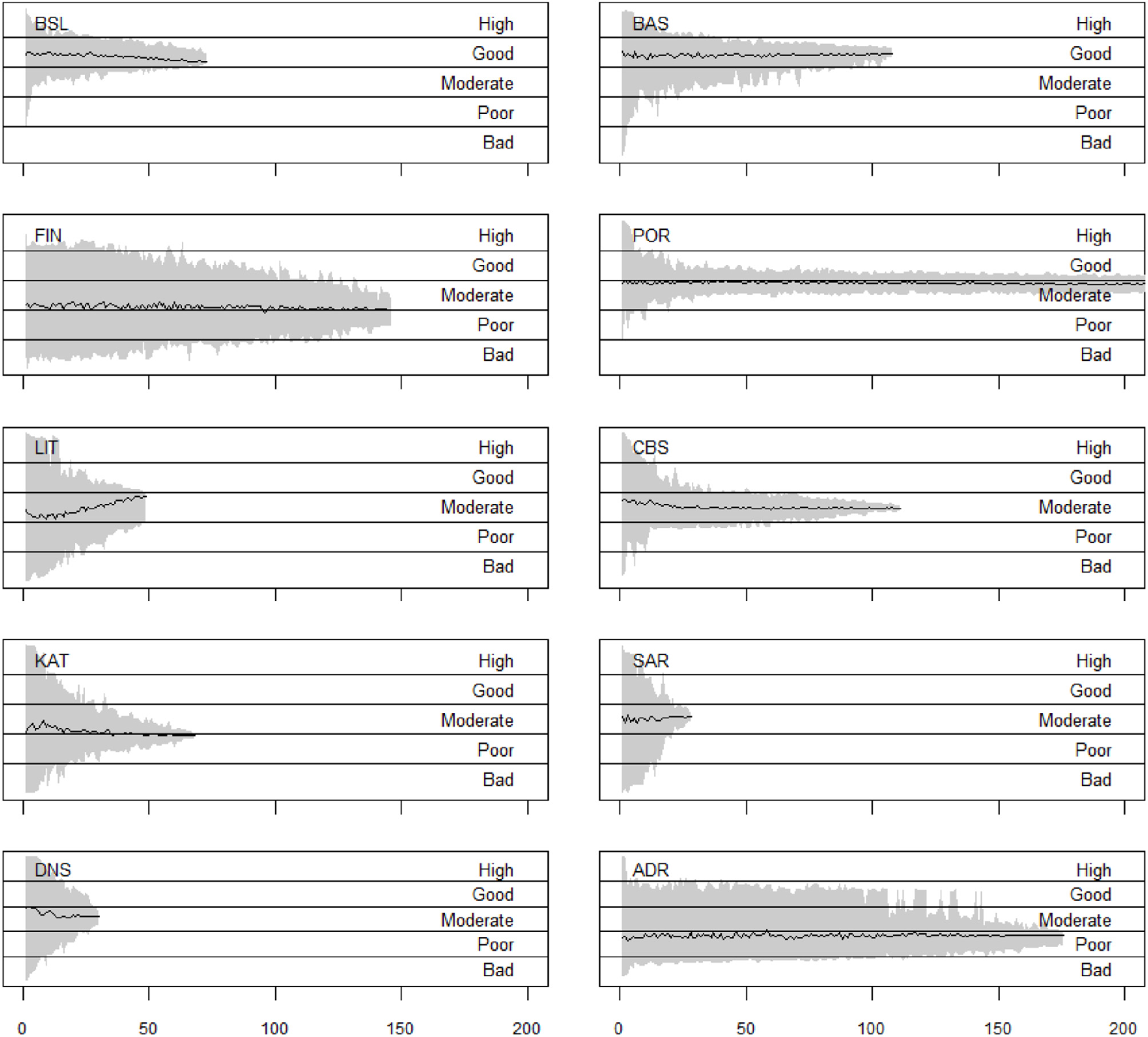 To test the sensitivity of the case study assessments to the selection and number of indicator values, a sensitivity analysis was performed by running the assessment using randomly selected indicator values. The number of indicator values included into the assessment varied from 1 to the maximum number of indicators in the case study minus one. This process was repeated 100 times for each number of indicator values. For example, take a case study with 120 indicator values. First, one random indicator value is selected and the assessment is done using only that indicator. This procedure is repeated 100 times. Then, two indicator values are picked at random, and the assessment is run using them; this again is repeated 100 times. This procedure is repeated for all numbers of indicator values up to 119. This results in a large number of values whose divergence can be analyzed to see if any patterns can be identified.