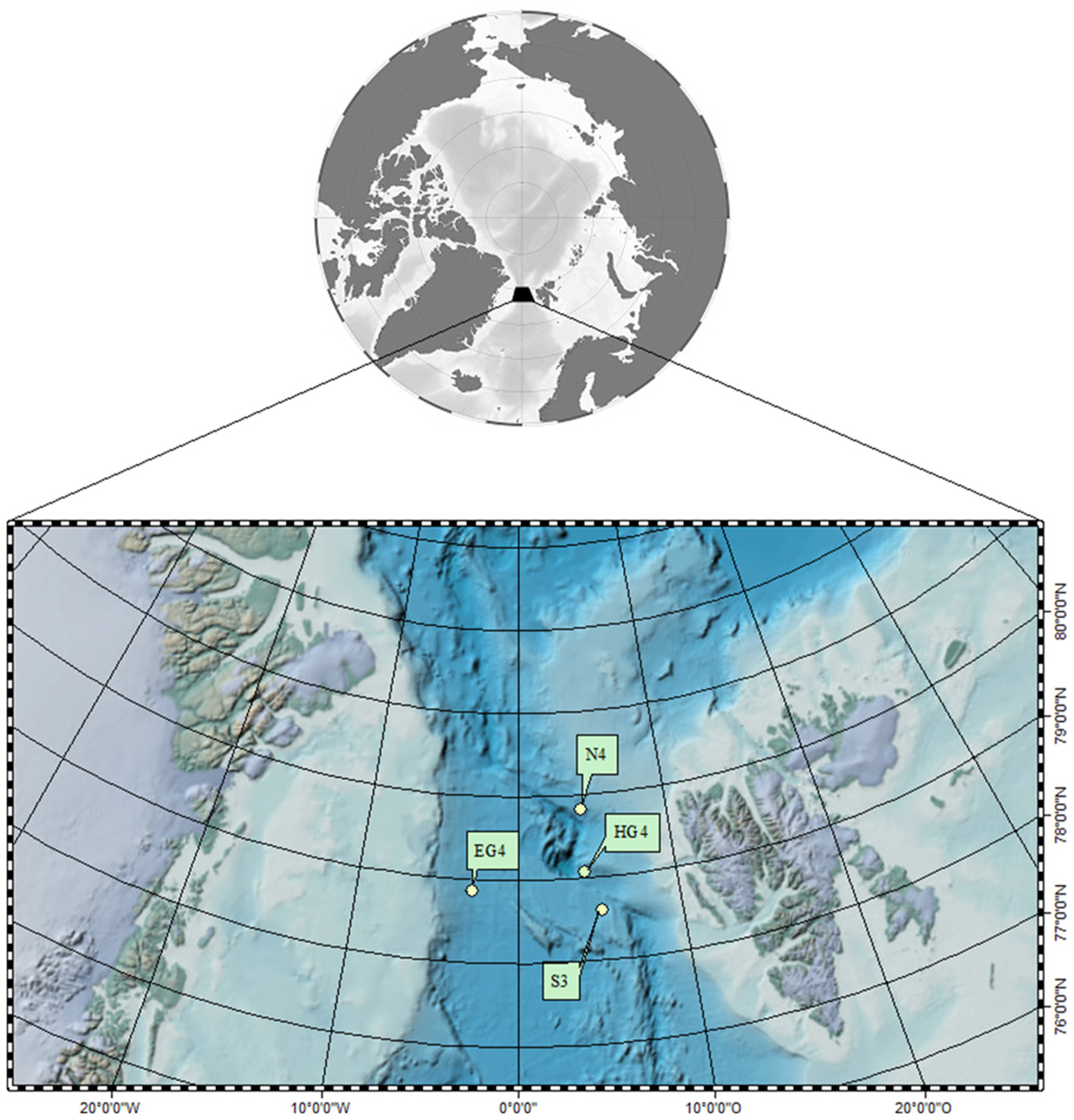 Location of the sampling stations in the Long-Term Ecological Research (LTER) observatory HAUSGARTEN (78. 42° N, 2.27° E and 79.50°N, 6.20°E) on a global map and a more detailed overview of the Fram Strait based on the Arctic Bathymetry Basemap (IBCAO/GEBCO_08). Stations sampled (from 24th of July until 4th of August 2015) for this project are indicated by dots (for exact positions see coordinates listed in the Supplementary Table S1). Landmasses depict Greenland and Spitsbergen, light green color marks continental shelves.