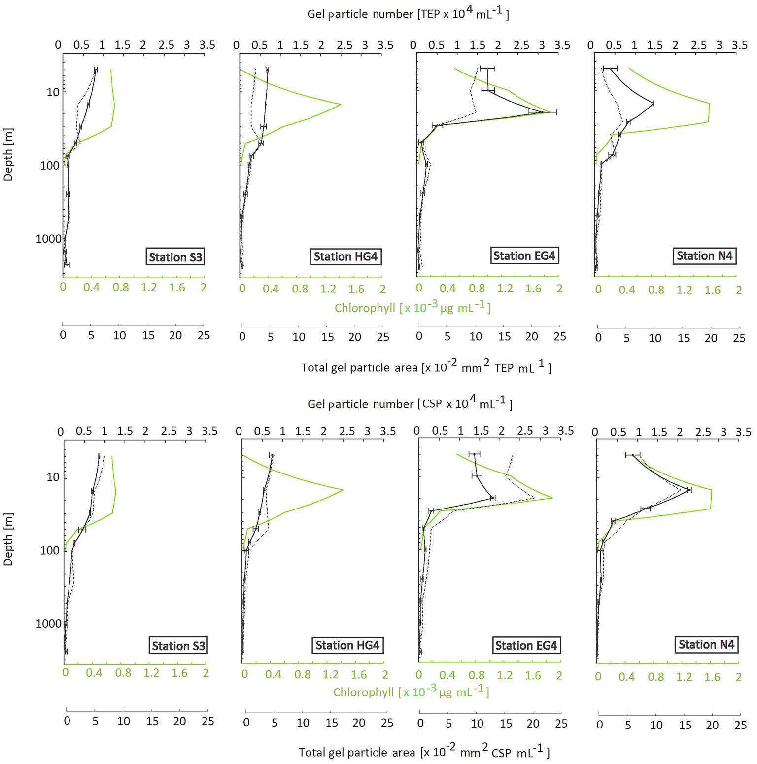 Vertical profiles of gel particle number (black line with errorbars that represent standard deviation of the two replicates), total gel particle area (dashed line; interpolated between sample depths) and chlorophyll a (green line). Y-axis inverse, with logarithmic scaling.