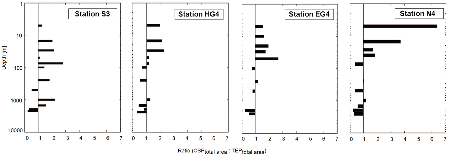 For the shallow depths (<100 m), total area (mm2 mL−1) of CSP was higher than total area of TEP with only a few exceptions (Figure 3). At deeper depths, the pattern reversed at most stations (all except S3), showing relatively higher TEP amounts in terms of total area compared to CSP.