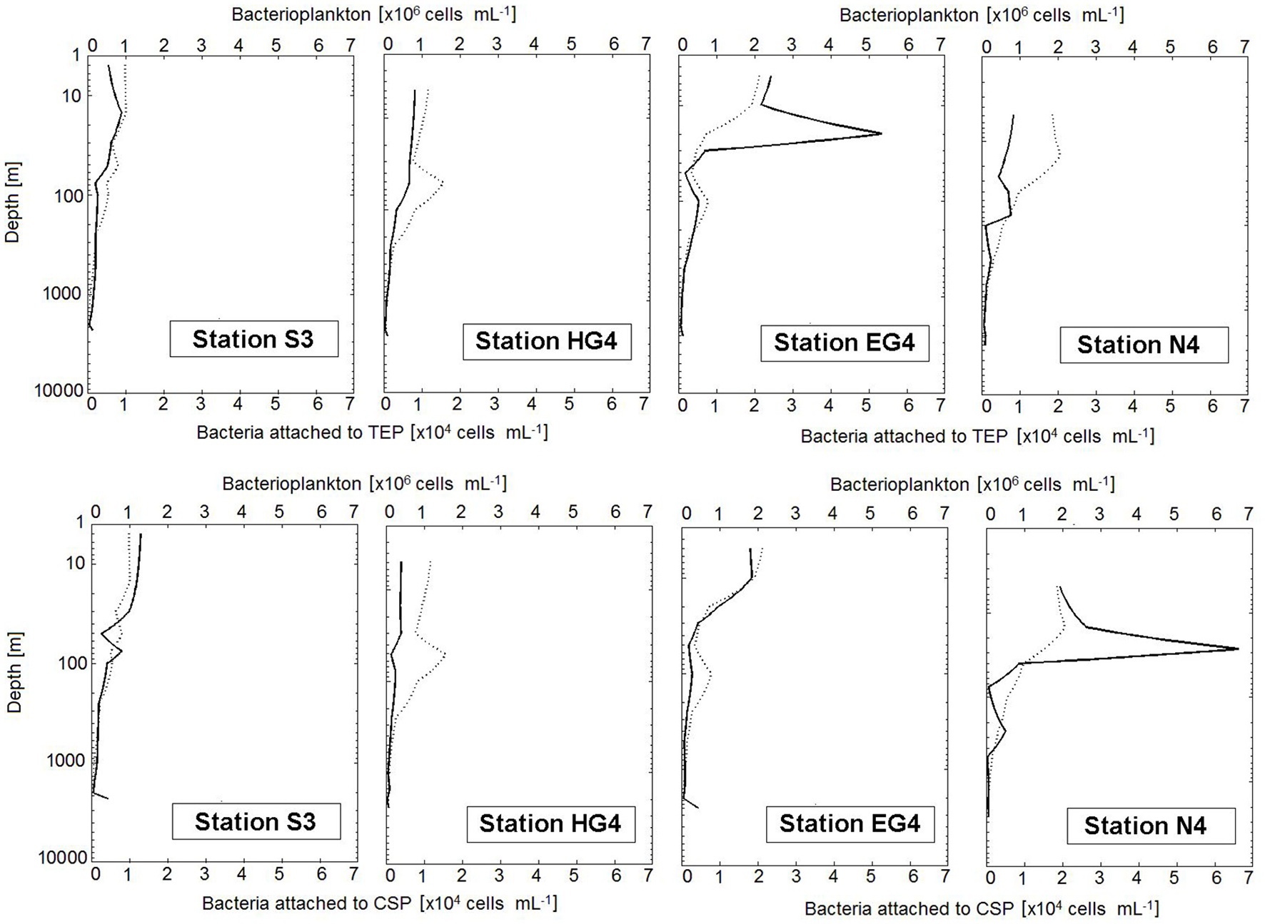 Both gel particle types, TEP and CSP, were colonized by bacteria throughout the whole water column, yielding an average bacterial density over all depths, stations and particle types of 26 ± 18% SD ×104 cells mm−2. Concentrations of bacteria attached to gel particles (cells per volume of seawater [mL−1]) were calculated using the sums of total bacterial frequencies per gel particle size class (mL−1) and the calculated total gel particle areas (mL−1) (see Methods for details). In general, concentrations of free-living bacterioplankton cells as well as of bacteria attached to gel particles decreased with depth, but showed some variance in abundance with increasing depth (Figure 5). Bacterioplankton concentrations (cells per volume of seawater [mL−1]) measured by flow cytometry were approximately two orders of magnitude higher than concentrations of TEP or CSP associated bacteria, respectively.