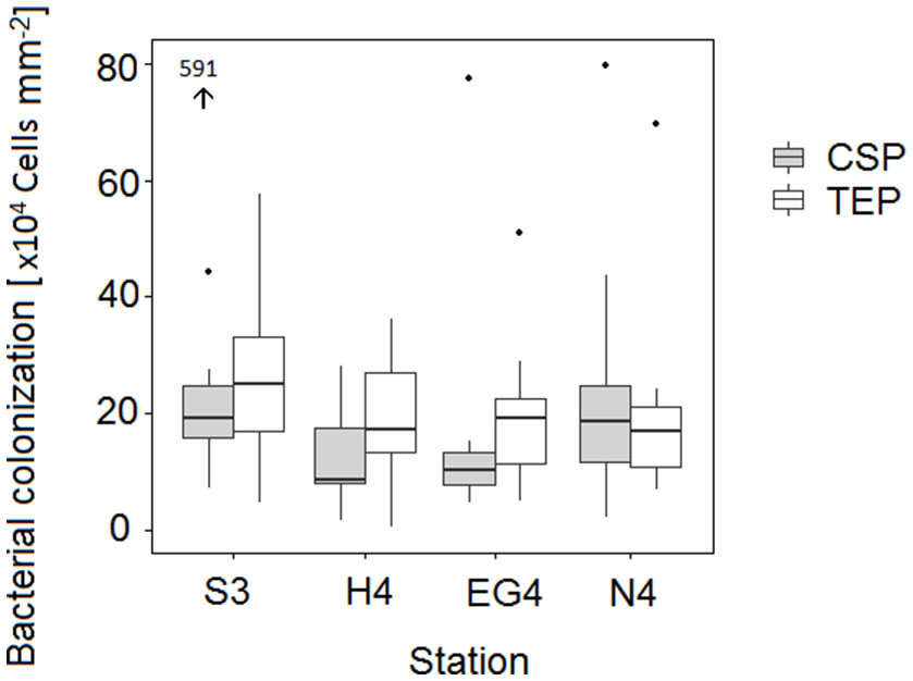 Difference in bacterial colonization (mm−2) between the two gel particle types (TEP and CSP), combined for all depths at the four stations. Values presented in the graph were calculated from total bacterial abundances (i.e., bacterial frequency sums per particle size classes in 1 L of seawater) and the total areas of gel particles (in 1 L of seawater). Outliers are represented by dots and also by the black arrow (the number next to the arrow indicates the respective y-value).