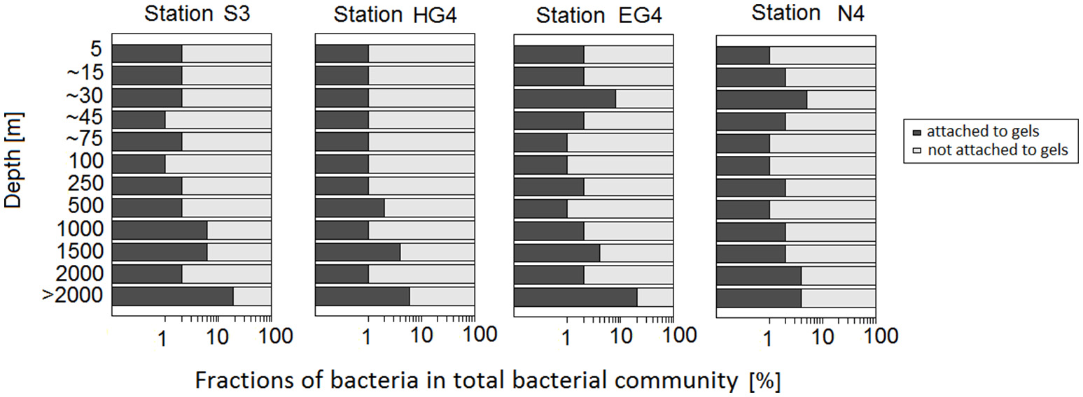 Fractions of bacteria in the total bacterial community (%) over depth at the four sampling stations. Dark gray bars represent data for bacteria attached to gel particles. Light gray bars represent bacterioplankton fractions. Depths indicated with “~” represent medians of the four stations (as sampling depths in the euphotic zone were slightly adjusted at each station to sample the chlorophyll maximum and its gradient). “> 2,000 m” refers to depths below 2,000 m. X-axis has logarithmic scaling.