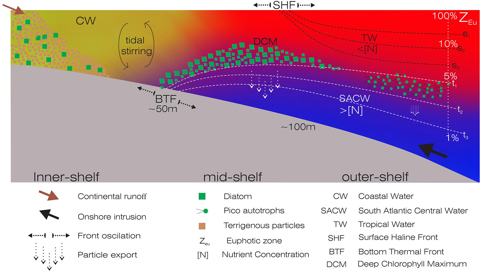 Schematic representation of a typical cross-shelf transect showing the positions of the Surface Haline Front (SHF) and the Bottom Thermal Front (BTF), and the associated biogeochemical processes. The overlying water masses are shown as follows: Coastal Water (CW) in yellow, Tropical Water (TW) in red, South Atlantic Central Water (SACW) in blue. Different arrows represent the continental runoff, onshore intrusion, front oscillations and particle export. Green squares and dots represent autotrophic communities. Redrawn from the Project OCEANOS/CARBOM (Environmental Characterization and Evaluation of Biogenic Ocean Resources from the Brazilian Continental Shelf and the Adjacent Oceanic Zone).