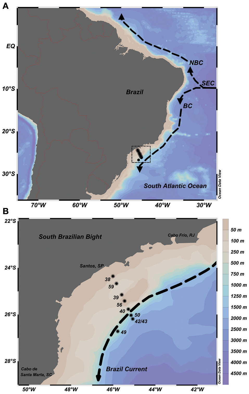 Sampling map on the Brazilian continental shelf, Southwestern Atlantic Ocean. (A) Basic scheme of circulation: The South Equatorial Current (SEC) bifurcates into the North Brazil Current (NBC) and the Brazil Current (BC). (B) Oceanographic stations sampled in January 2013 (black dots), bathymetry of the South Brazilian Bight and the Brazil Current flowing southward (dashed arrow).