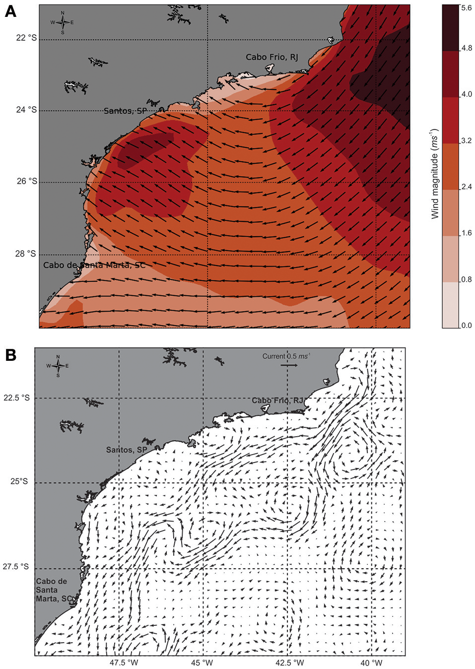 Summer scenario during the sampling period in the South Atlantic Ocean: (A) Wind direction and magnitude (m.s−1), (B) Geostrophic velocity (m.s−1) from daily-mean observations.