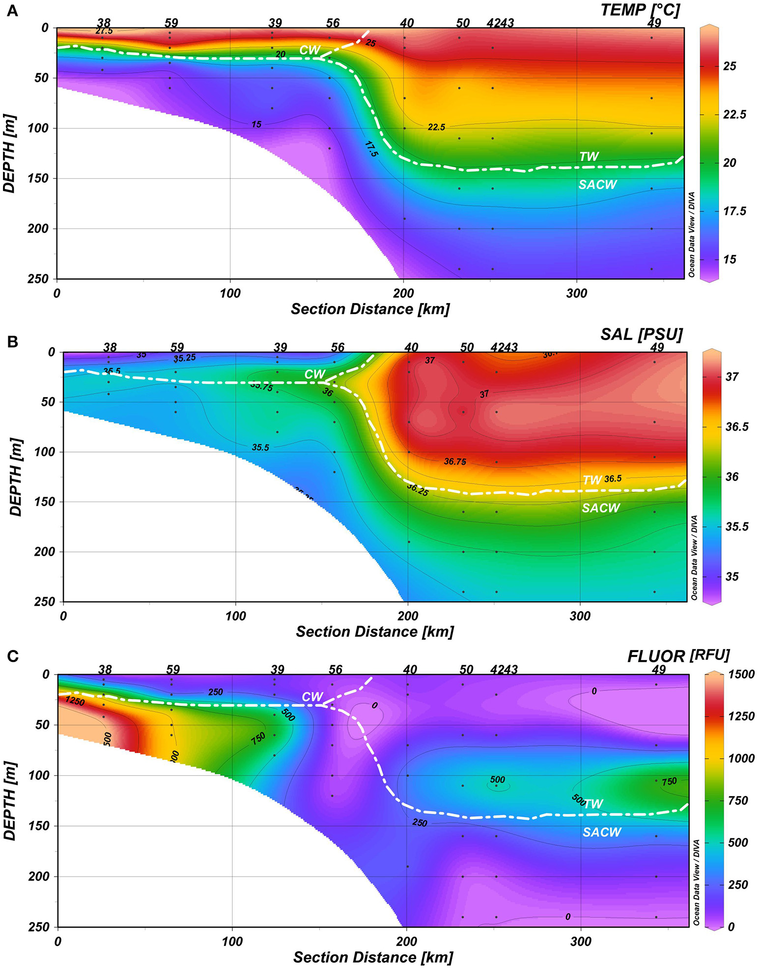 Relatively lower temperatures and lower salinities were associated with fluorescence peaks (>900 RFU) and upward enhancement of the DCM due to the thermocline rise. Chlorophyll fluorescence ranged from 3.83 at station 49 to 1457.72 RFU at station 38; and the maximum values occurred on the continental shelf at ~50 m, beyond the continental slope at ~100 m, as well as in the mixed layer (Figure 4C).