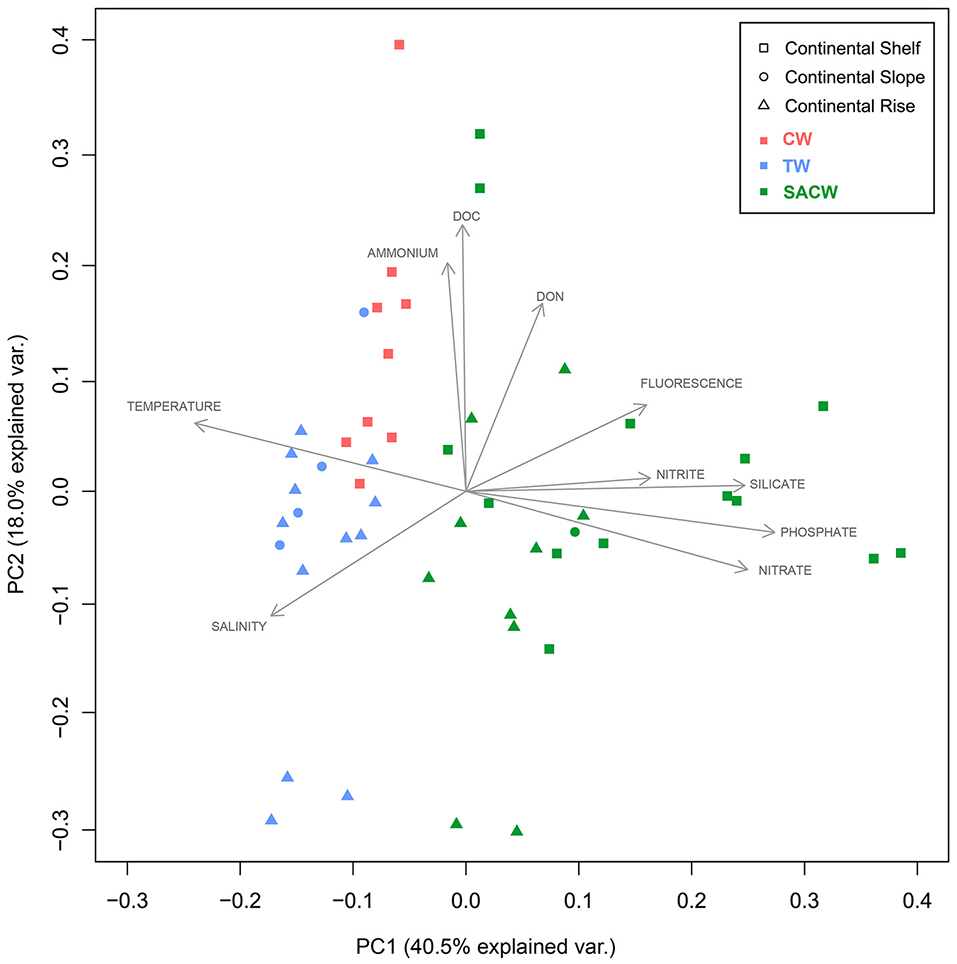 A principal component analysis (PCA, n = 51) based on Euclidean distance was performed to study the influence of environmental parameters (temperature, salinity, fluorescence, inorganic nutrients, DOC, and DON) on the sample distributions. For both analyses, the samples were classified according to their sampling location across the continental margin, and their respective water mass signatures. Additionally, to verify differences in biological groups between locations (continental shelf, slope, and rise) and water masses (CW, TW, and SACW), we performed a permutational multivariate analysis of variance (PERMANOVA, adonis function) using the vegan package (Anderson, 2001).