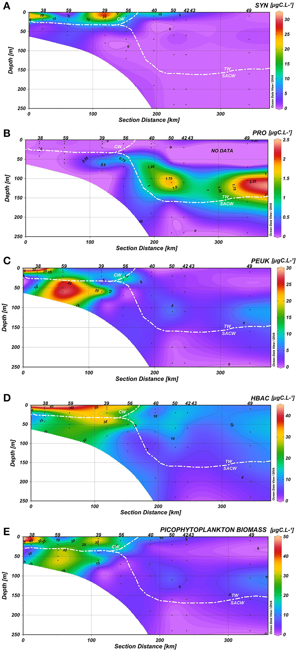 Carbon biomass (μgC.L−1) distribution of (A)Synechococcus (SYN), (B)Prochlorococcus (PRO), (C) Picoeukaryotes (PEUK), (D) Heterotrophic bacteria (HBAC), (E) Total picophytoplankton in the water column along the coastal-ocean gradient.
