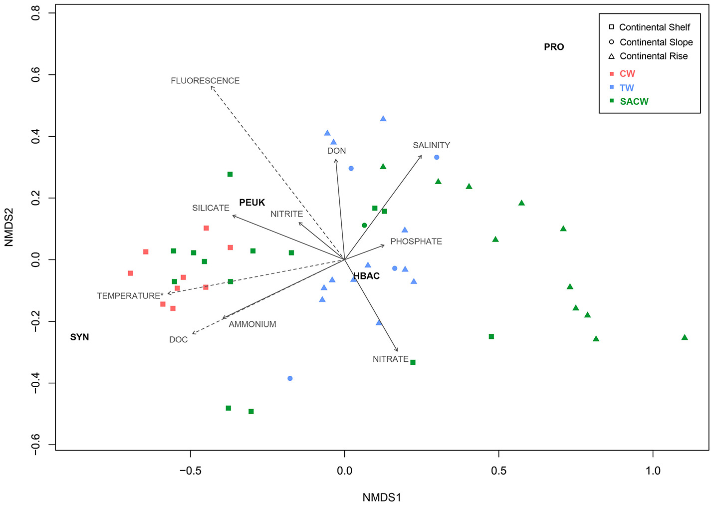 Synechococcus were mainly distributed along the continental shelf and driven by higher temperatures, DOC and ammonia, that showed high negative correlations with nMDS axis 1. Higher Synechococcus carbon biomass was related to the water masses CW and SACW. Prochlorococcus were mostly present on the continental rise, characterized by relatively higher salinities and lower temperatures of deeper waters. Picoeukaryotes were mainly related to the inner continental shelf, with higher fluorescence, silicate and nitrite. Heterotrophic bacteria did not seem to respond to any abiotic condition.