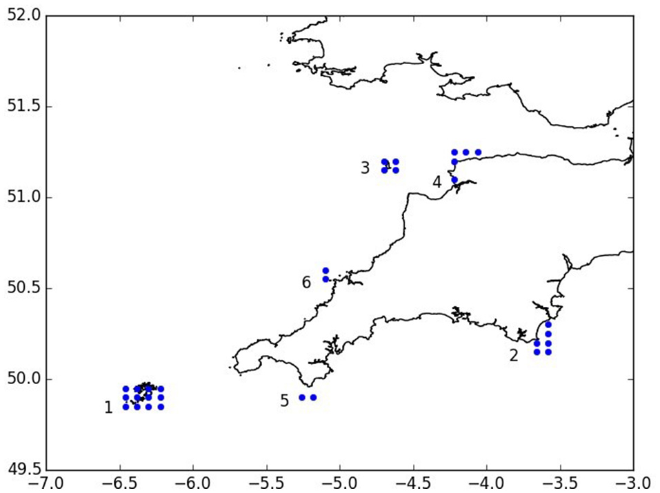 Particle release locations (blue dots): 1. Isles of Scilly SAC, 2. Skerries Bank and Surrounds MCZ, 3. Isle of Lundy SAC, 4. Bideford to Foreland Point MCZ, 5. The Lizard SAC, 6. Padstow Bay and Surrounds MCZ.