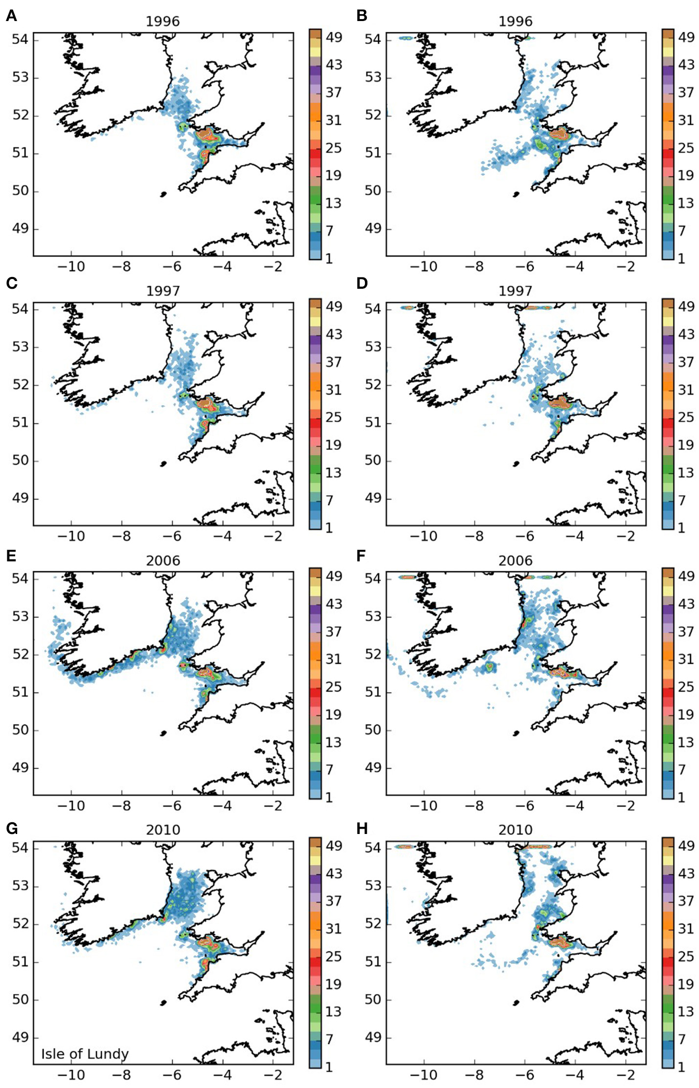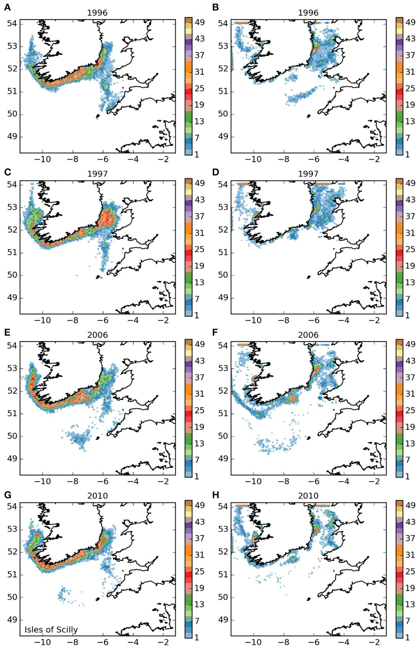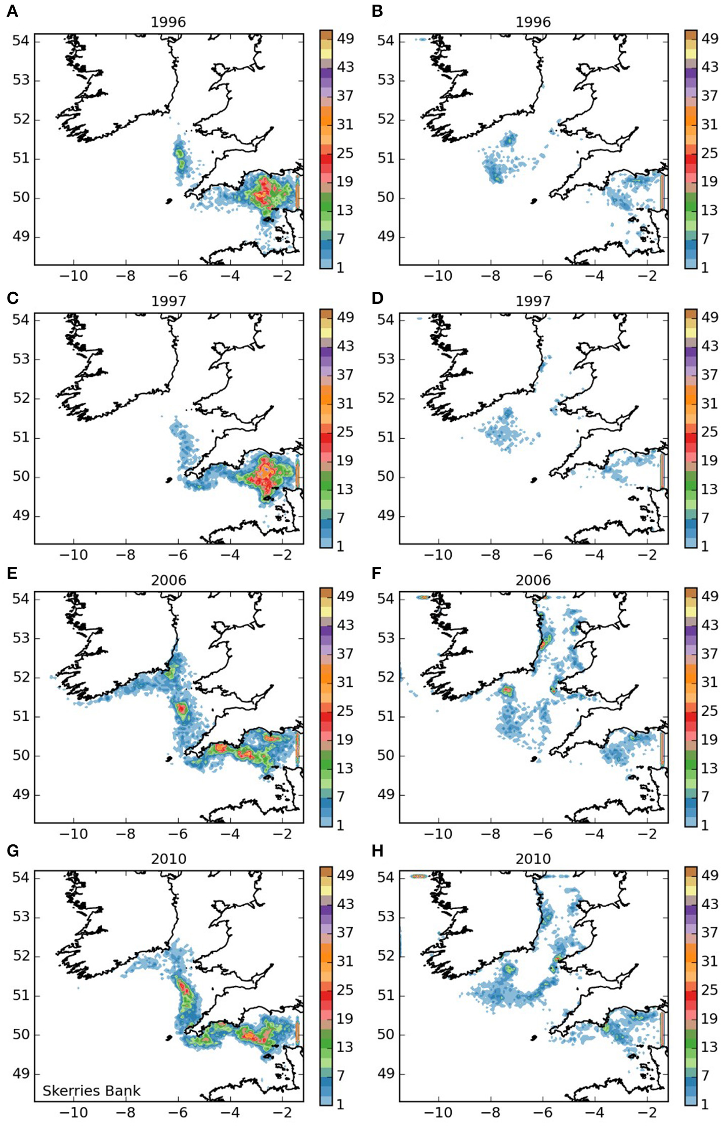 Final number of particles per model grid cell (density) for particles released from the Isles of Scilly SAC for each of the 4 years. (A,C,E,G) 5 months pelagic duration, (B,D,F,H) 12 months pelagic duration.