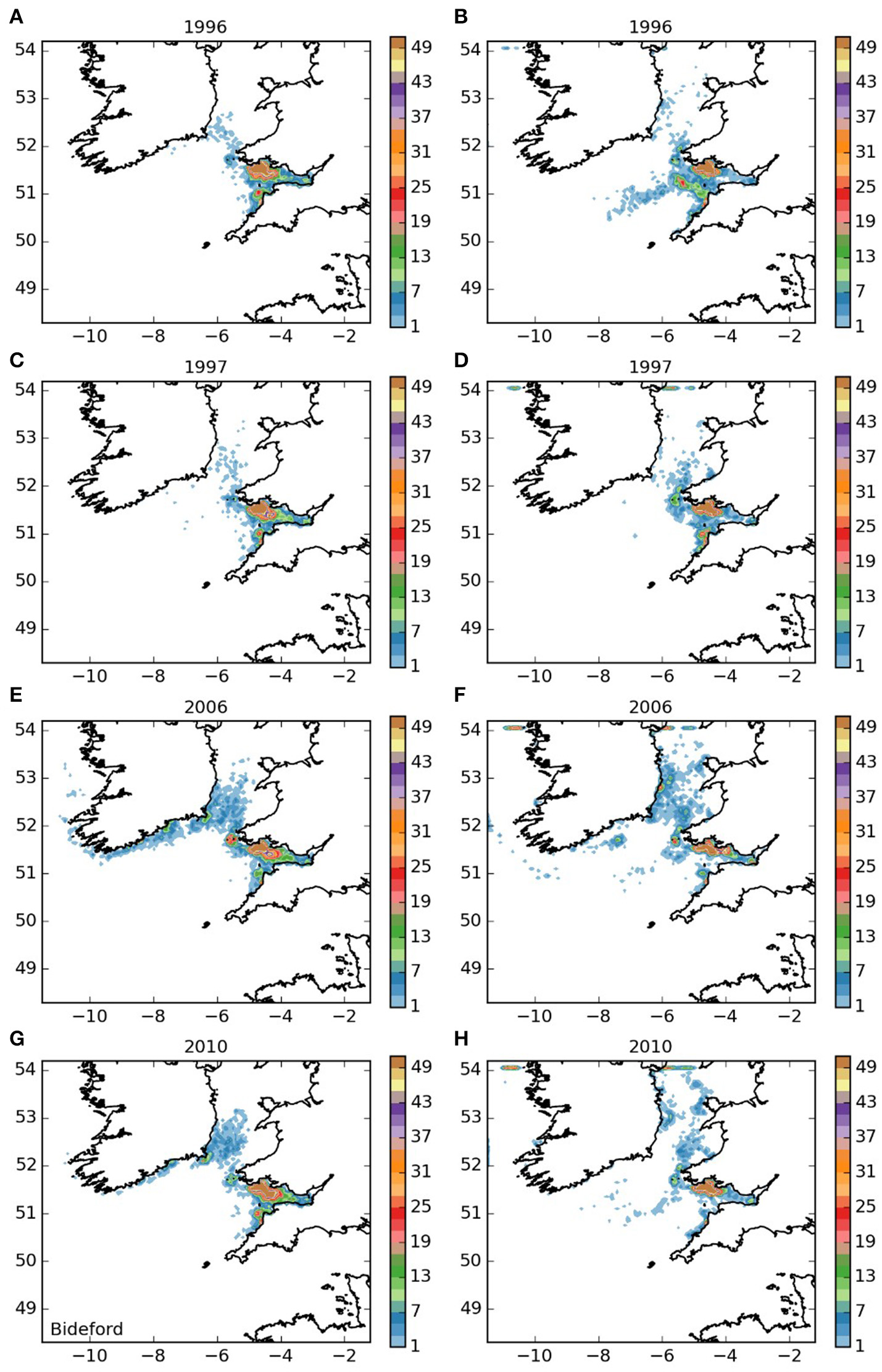 Final number of particles per model grid cell (density) for particles released from Bideford to Foreland Point MCZ for each of the 4 years. (A,C,E,G) 5 months pelagic duration, (B,D,F,H) 12 months pelagic duration.