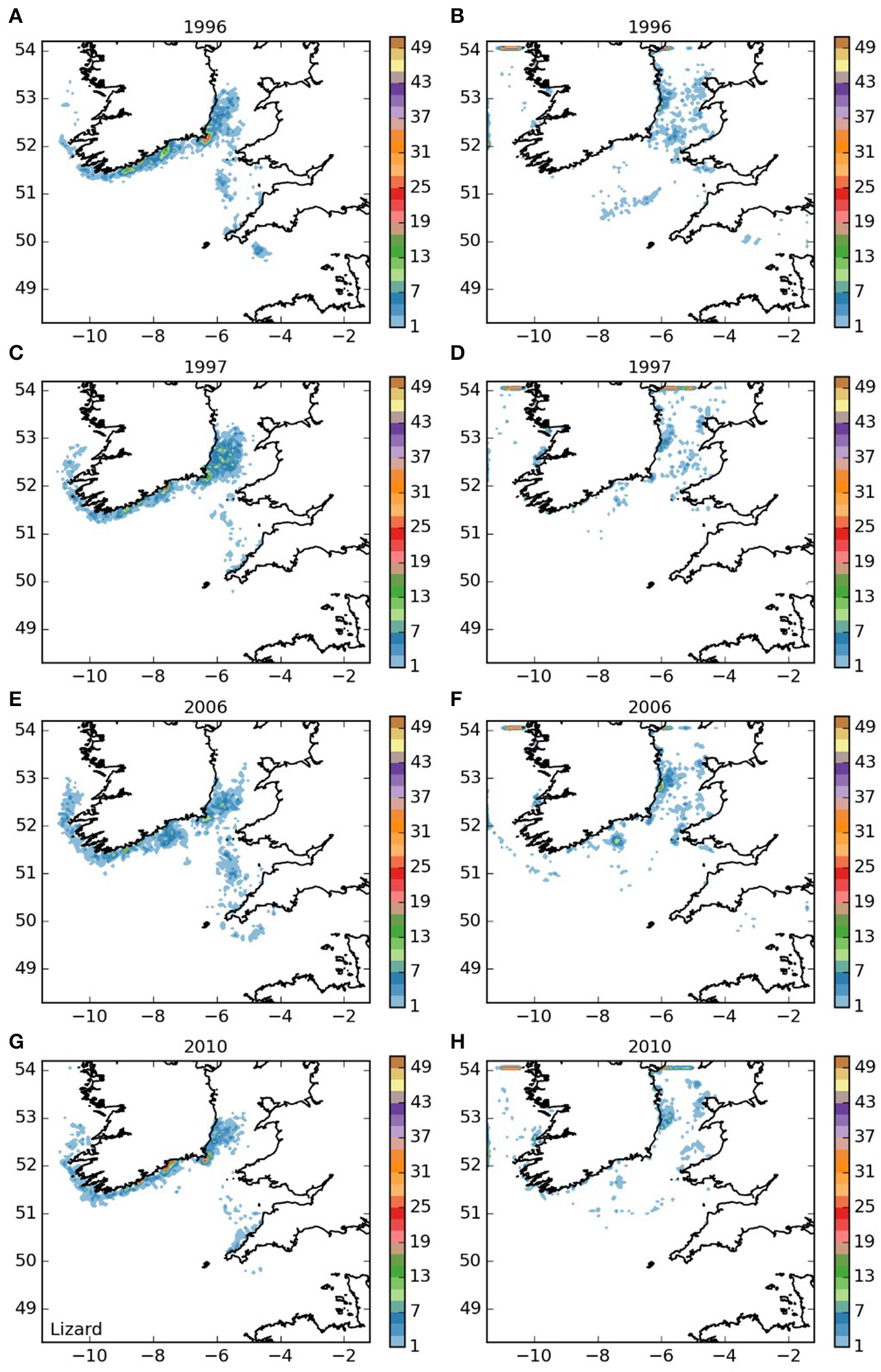 Final number of particles per model grid cell (density) for particles released from Lizard Point SAC for each of the 4 years. (A,C,E,G) 5 months pelagic duration, (B,D,F,H) 12 months pelagic duration.