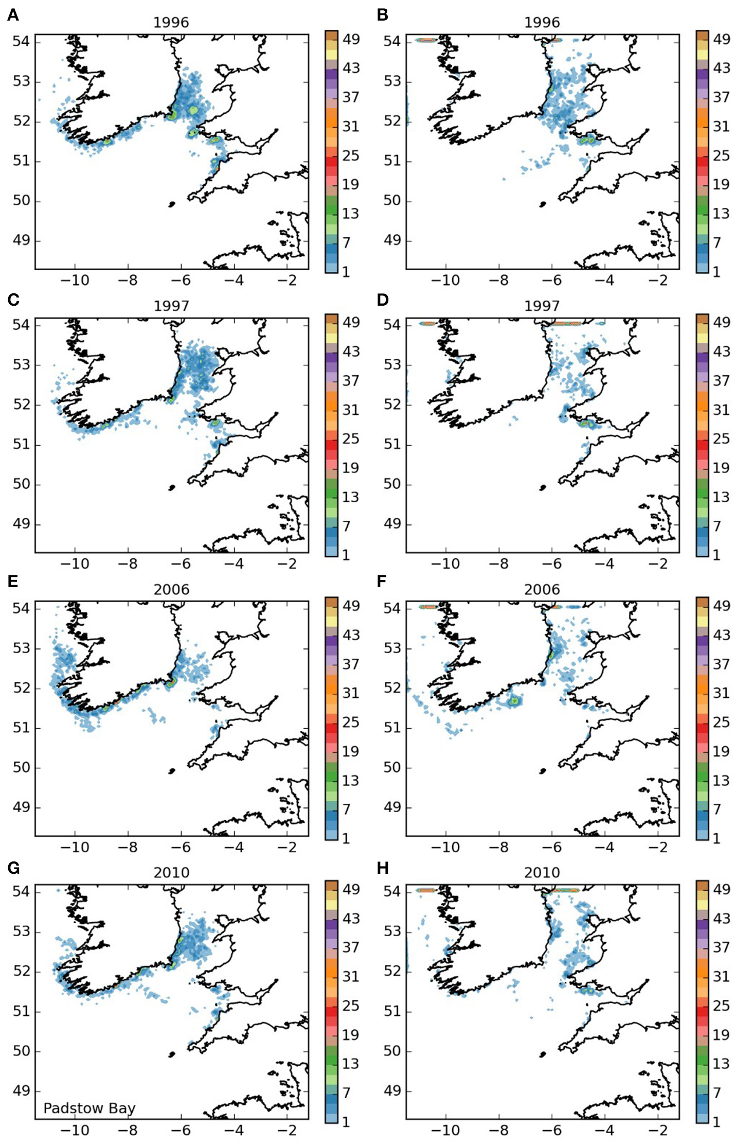 Final number of particles per model grid cell (density) for particles released from Padstow Bay and Surrounds MCZ for each of the 4 years. (A,C,E,G) 5 months pelagic duration, (B,D,F,H) 12 months pelagic duration.