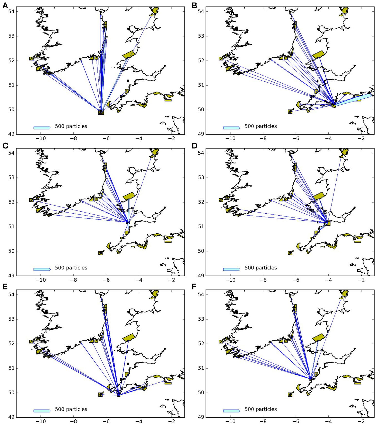 Connectivity between release areas and MPAs (green polygons) for the particles with 5 month larval duration: (A) Isles of Scilly SAC, (B) Skerries Bank and Surrounds MCZ, (C) Lundy SAC, (D) Bideford to Foreland Point MCZ, (E) The Lizard Point SAC, (F) Padstow Bay and Surrounds MCZ. The width of the arrows is proportional to the number of particles.