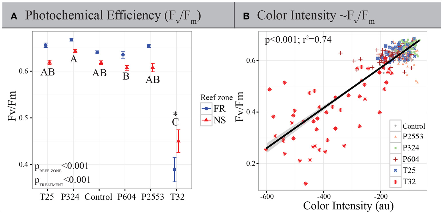 Figure 1. Physiological measurements of in hospite Symbiodinium. (A) Photochemical efficiency of Symbiodinium photosystem II (PSII) (Fv/Fm) after 94 days in experimental treatments. Blue circles: forereef population average (±SE); red triangles: nearshore population average (±SE). Asterisk (*) indicates a significant interaction between treatment and reef zone. Treatment pairs lacking a letter in common indicate a statistically significant difference between those treatments pursuant to Tukey's Honest Significant Difference tests. High temperatures reduce Fv/Fm, however, symbionts from nearshore environments remain significantly higher than those from the forereef, while forereef symbionts exhibit higher Fv/Fm in all other treatments. (B) Maximum Fv/Fm of Symbiodinium vs. mean coral color intensity after 94 days in experimental treatments (T25 = 25.01 ± 0.14°C, 515 ± 92 μatm; Control = 28.16 ± 0.24°C, 477 ± 83 μatm; P324 = 28.14 ± 0.27°C, 324 ± 89 μatm; P604 = 28.04 ± 0.28°C, 604 ± 107 μatm; P2553 = 27.93 ± 0.19°C, 2553 ± 506 μatm; T32 = 32.01 ± 0.17°C, 472 ± 86 μatm), as measured by the sum of all color intensities in the red, green and blue channels in standardized coral photographs across all treatments. This relationship demonstrates that Fv/Fm and coral color (a proxy of bleaching) are highly correlated.
