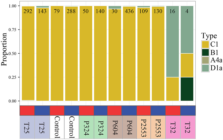 Figure 2. Proportion of RNAseq reads mapping exclusively to one Symbiodinium lineage (A4a, B1, C1, D1a) for each transcriptome library, with independent columns representing a unique transcriptome library. Number at top of bar indicates total number of reads mapping exclusively to one clade within that library. Red and blue blocks indicate that the library originated from nearshore and forereef corals, respectively. Treatment conditions are noted below the bar (T25 = 25.01 ± 0.14°C, 515 ± 92 μatm; Control = 28.16 ± 0.24°C, 477 ± 83 μatm; P324 = 28.14 ± 0.27°C, 324 ± 89 μatm; P604 = 28.04 ± 0.28°C, 604 ± 107 μatm; P2553 = 27.93 ± 0.19°C, 2553 ± 506 μatm; T32 = 32.01 ± 0.17°C, 472 ± 86 μatm). All libraries were dominated by Symbiodinium goreaui (C1), excepting the T32 treatments that were dominated by Symbiodinium trenchii (D1a).