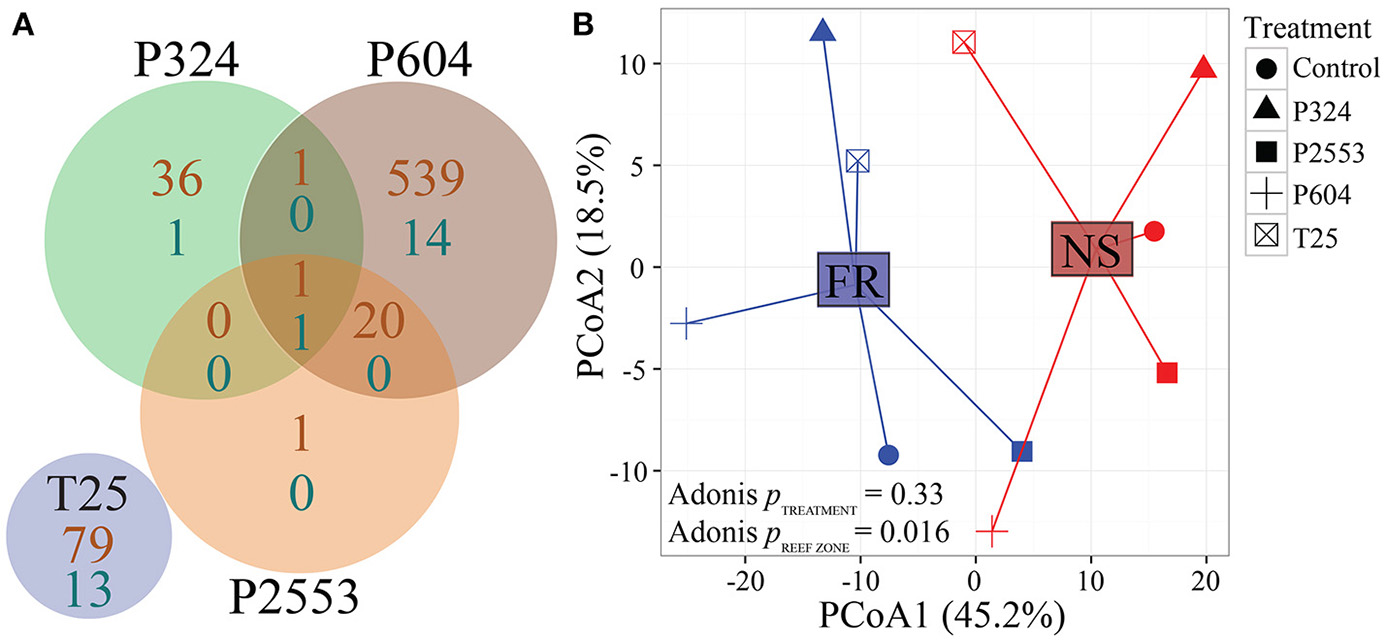 Figure 3. Global RNAseq patterns for in hospite Symbiodinium goreaui under different pCO2 (28°C) and low temperature (25°C) treatments. (A) Venn diagram of the number of differentially expressed S. goreaui genes (out of 45,947, FDR = 0.05) in experimental conditions relative to control conditions. Orange numbers indicate overrepresented genes and turquoise numbers indicate underrepresented genes, but overall very little transcriptomic response is observed. (B) Principal coordinate analysis of all r-log transformed isogroups clustered by experimental treatment and reef zone, demonstrating significantly different transcriptome profiles across S. goreaui from different locations, regardless of experimental treatment (NS = nearshore and FR = forereef; T25 = 25.01 ± 0.14°C, 515 ± 92 μatm; Control = 28.16 ± 0.24°C, 477 ± 83 μatm; P324 = 28.14 ± 0.27°C, 324 ± 89 μatm; P604 = 28.04 ± 0.28°C, 604 ± 107 μatm; P2553 = 27.93 ± 0.19°C, 2553 ± 506 μatm).