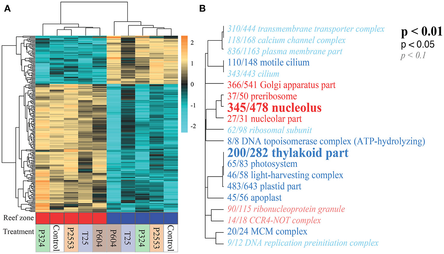 Figure 4. Differentially expressed genes (DEGs) of Symbiodinium goreaui across reef zones and treatments. (A) Heatmap for the top 300 DEGs for reef zone where each row is a gene and each column is a unique transcriptome library. The color scale is in log2 (fold change relative to the gene's mean) and genes and samples are clustered hierarchically based on Pearson's correlation of their expression across samples. Red and blue blocks indicate that libraries originated from nearshore and forereef corals, respectively. Treatment conditions are noted below the bar (T25 = 25.01 ± 0.14°C, 515 ± 92 μatm; Control = 28.16 ± 0.24°C, 477 ± 83 μatm; P324 = 28.14 ± 0.27°C, 324 ± 89 μatm; P604 = 28.04 ± 0.28°C, 604 ± 107 μatm; P2553 = 27.93 ± 0.19°C, 2553 ± 506 μatm). Hierarchical clustering of libraries (columns) demonstrates strong reef zone differences in gene expression. (B) Gene ontology (GO) enrichment of the “Cellular component (CC)” category derived from the transcriptomic differences across reef zones. Dendrograms depict sharing of genes between categories (categories with no branch length between them are subsets of each other), with the fractions corresponding to proportion of genes with an unadjusted p < 0.05 relative to the total number of genes within the category. Text size and boldness indicate the significance (Mann–Whitney U tests) of the term. Blue categories are enriched in forereef S. goreaui while red categories are enriched in nearshore S. goreaui. Forereef S. goreaui exhibit enrichment of GO categories associated with photosynthesis.