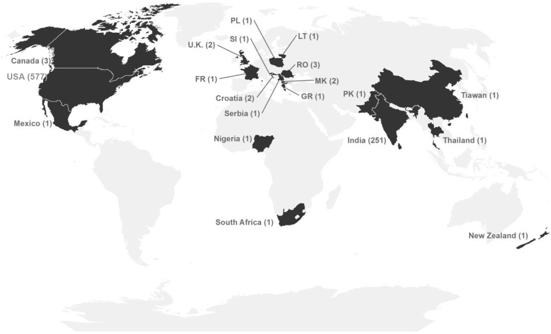The majority of the participants in this study indicated their permanent residence was the United States (n = 577). Approximately 1/4th of the participants indicated their permanent residence was in India (n = 251) and the remaining participants indicated that their permanent residence was in Canada (n = 3), Croatia (n = 2), United Kingdom (n = 2), France (n = 1), Greece (n = 1), Lithuania (n = 1), Macedonia (n = 2), Mexico (n = 1), New Zealand (n = 1), Nigeria (n = 1), Pakistan (n = 1), Poland (n = 1), Romania (n = 3), Serbia (n = 1), Slovenia (n = 1), South Africa (n = 1), Sri Lanka (n = 1), Taiwan (n = 1), and Thailand (n = 1) (Figure 2).