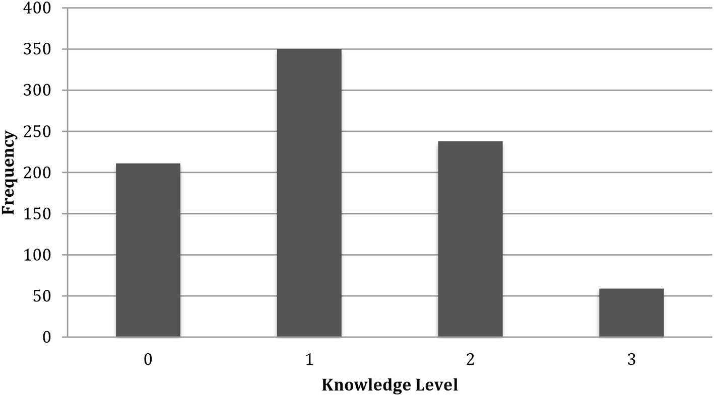 A one-way ANOVA was conducted to determine if the mean knowledge level differed by level of education of the participants. The one-way ANOVA was found to not be statistically significant [F(4, 858) = 0.624, p = 0.646, η2 = 0.003].
