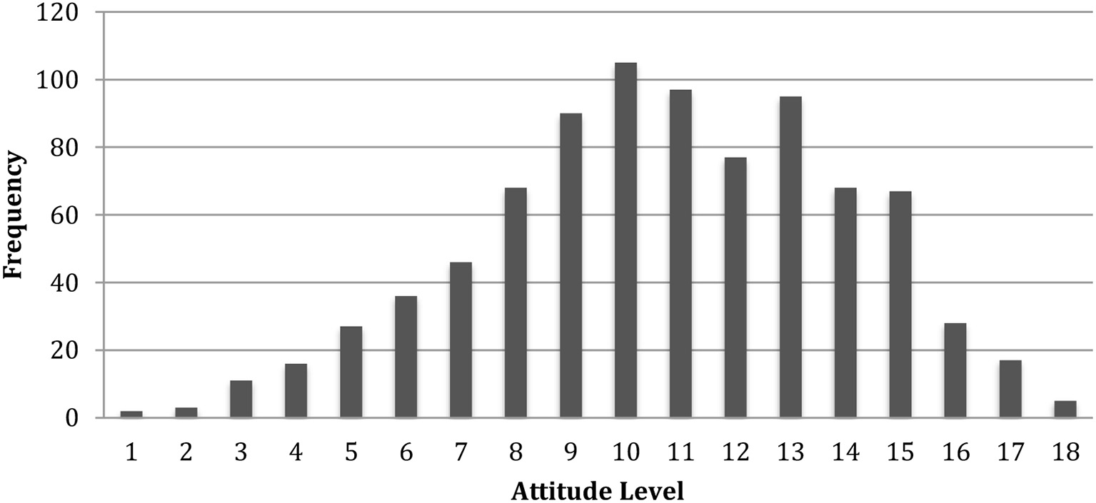The attitude index had a minimum possible score of zero and a maximum possible score of 18. Higher scores for this index represented the likelihood that a participant's attitudes would be more dolphin and whale positive and conservation oriented. The participant's scores ranged from one to 18 and the mean score was 10.713 (SD = 3.284) (Figure 4).
