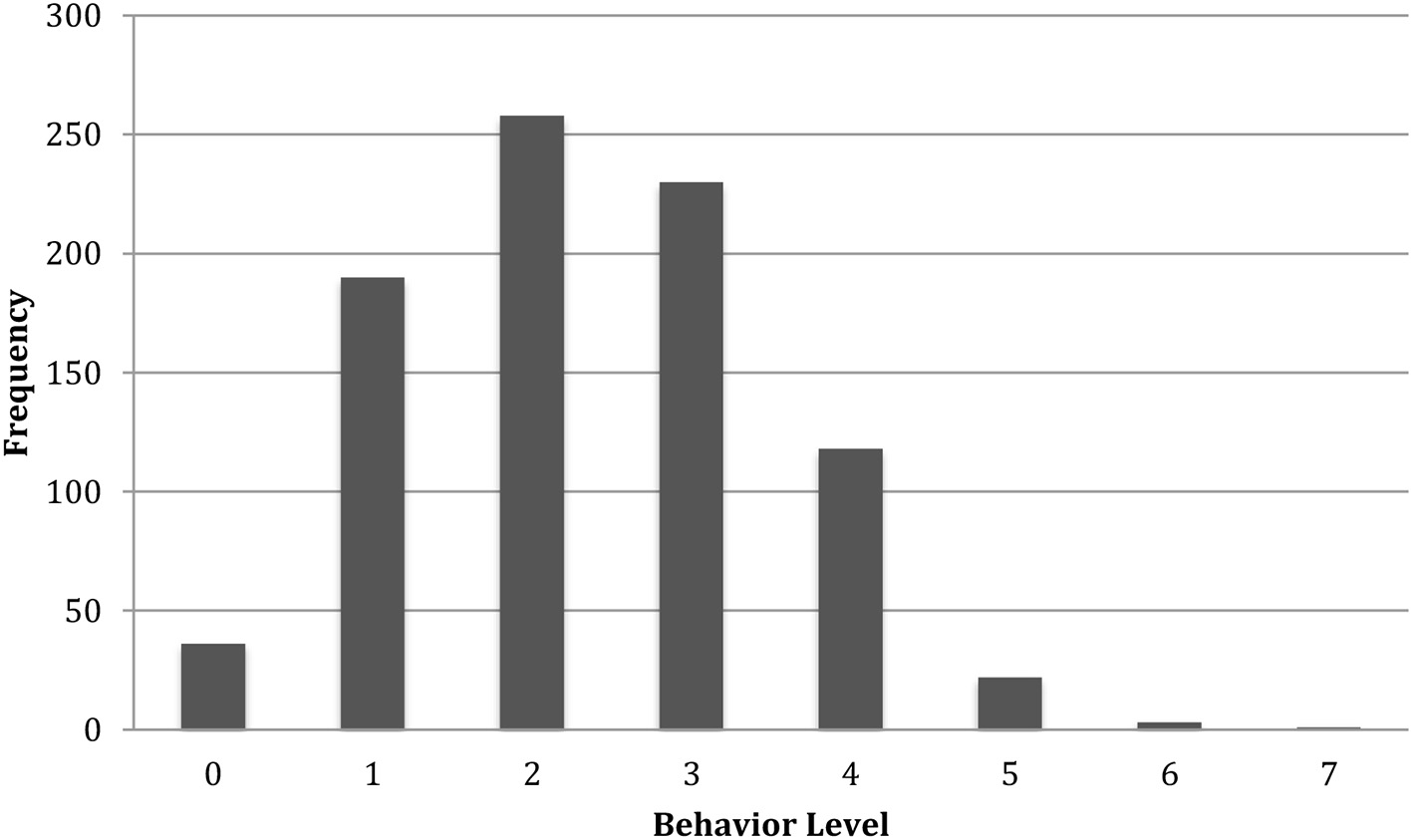 Range of respondents' behavior levels, indicating how pro- or anti-dolphin they would behave. Higher scores indicate more pro-dolphin behavior (n = 858).