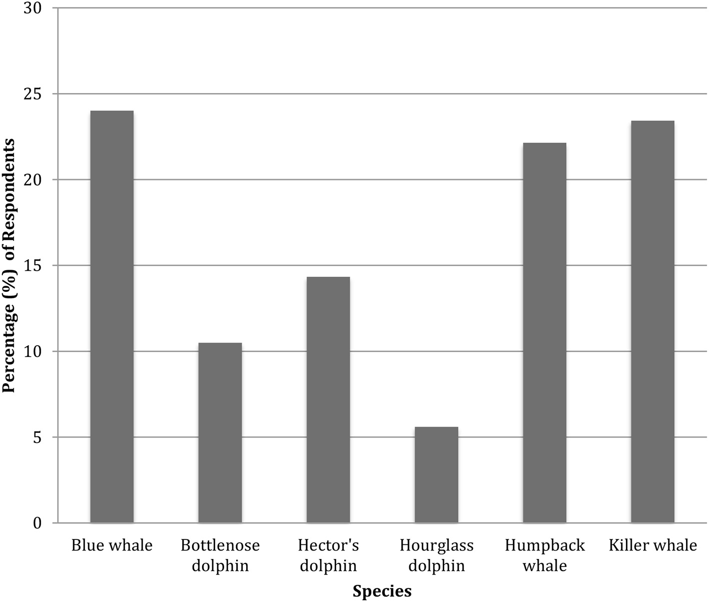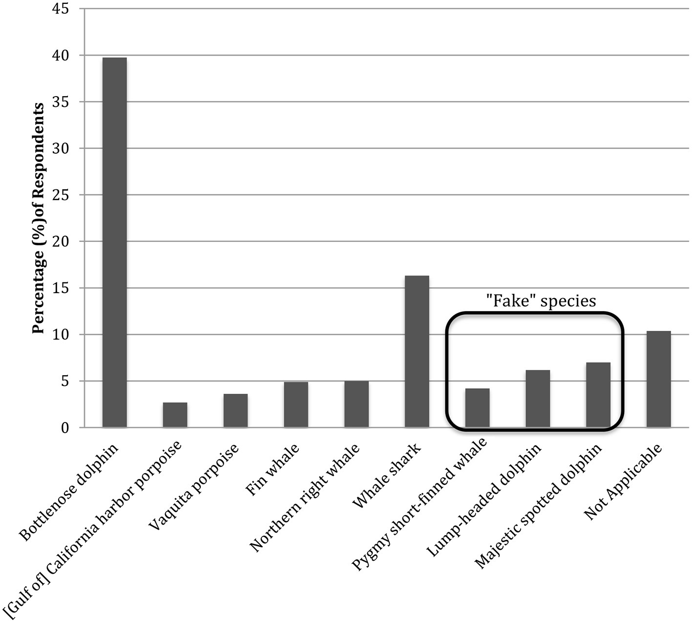 Which dolphin/whale species listed respondents felt was the most important to conserve. The whale shark is not a cetacean species. The Pygmy short-fined whale, the Lump-headed dolphin, and the Majestic spotted dolphin were included as “fake” species (n = 858).