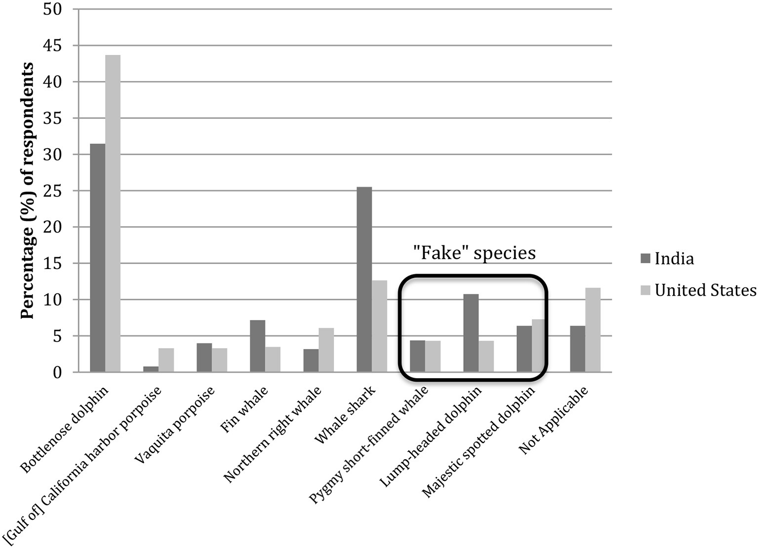 Which dolphin/whale species listed respondents from the United States and India felt was the most important to conserve. The whale shark is not a cetacean species. The Pygmy short-fined whale, the Lump-headed dolphin, and the Majestic spotted dolphin were included as “fake” species (US, n = 577; India, n = 251).