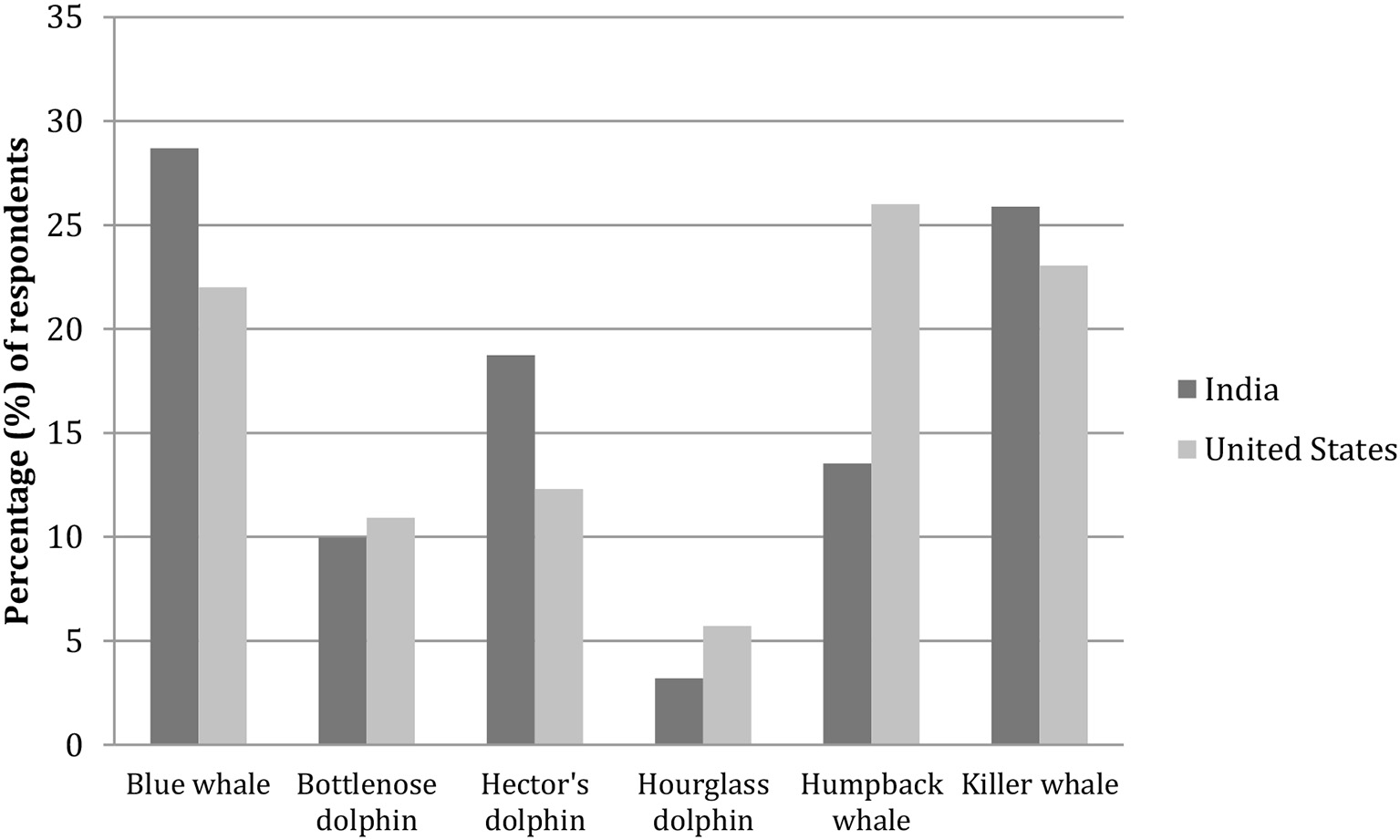 In 2015, an online survey was conducted to investigate public attitudes and perceptions toward key cetacean (whale, dolphin, and porpoise) conservation and “hot topic” issues such as legislative protection and whaling (n = 858). The vast majority of the participants in this study indicated their permanent residence was the United States (n = 577) or India (n = 251). Perceptions of participants on the conservation priority of cetacean species did not match with the factual IUCN status, where most participants assumed that the larger and more charismatic whales (blue whale, 24.01%; humpback whale, 22.14%; and killer whale, 23.43%) were more endangered or more important to conserve than the small cetacean species such as the Vaquita or Hector's dolphin. Additionally, 39.74% of participants indicated that they thought bottlenose dolphin was the most important to conserve. More members of the public highlighted non-existent (fake) species (e.g., pygmy short-fined whale, lump-headed dolphin, and majestic spotted dolphin) as being of conservation concern than certain species of actual, genuine concern. The majority of participants considered dolphins and whales to be “under protected” or only “slightly protected” (29.95%; 41.96%, respectively) and expressed that marine mammal conservation laws and policies were “very important” or “important” (47.43 and 37.88%, respectively). In addition, 86.83% of participants expressed opposition to the hunting of dolphins and whales (57.93% “strongly opposed” and 28.90% “opposed”); however, only 47.44% of participants were aware that several countries are still involved in whaling. A lack of awareness of the conservation status of whales and dolphins and continued whaling activities suggests that greater outreach to the public about the conservation status of whale and dolphin species is needed.