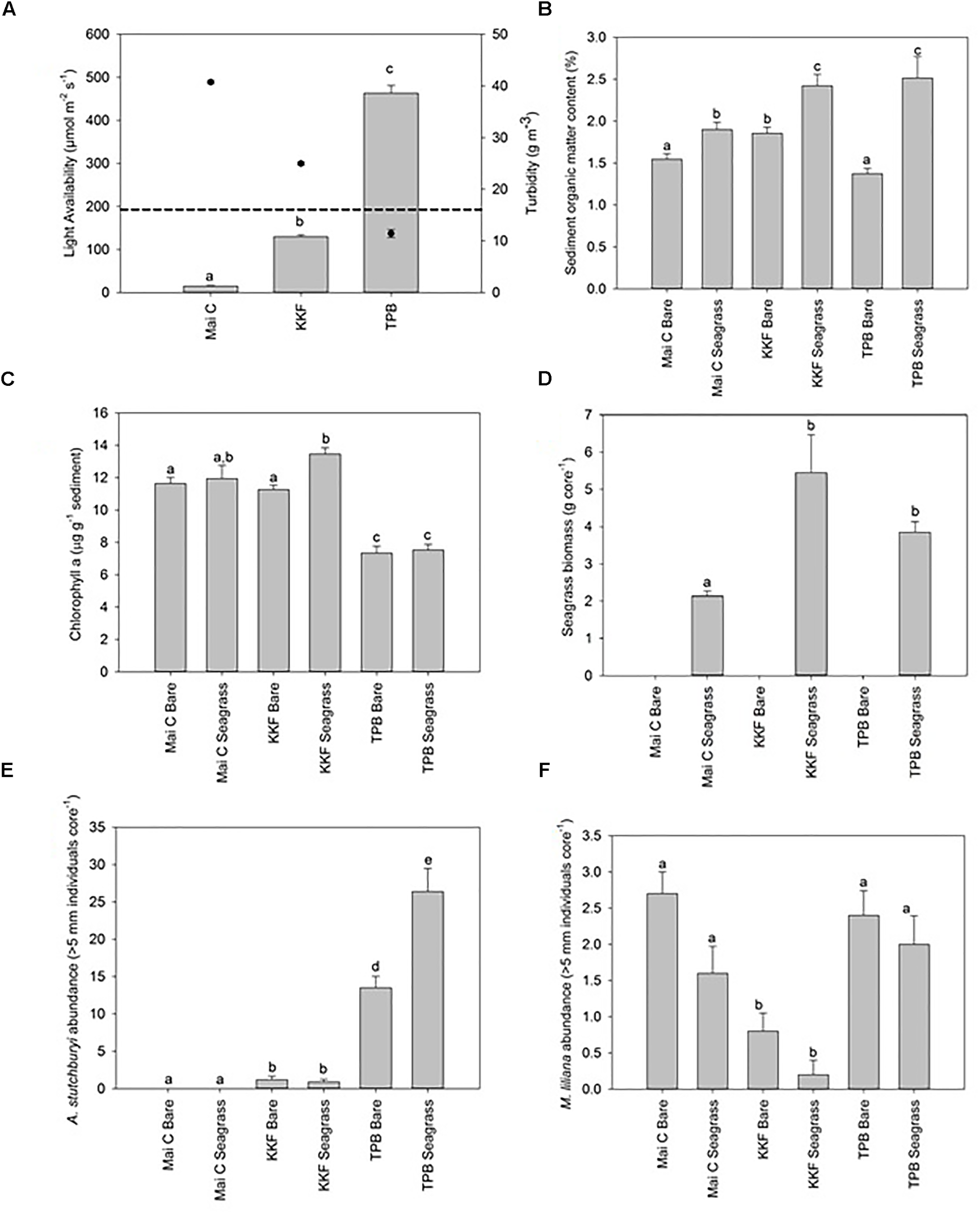 Physical and biological site characteristics ±1 standard error. n = 10 per site/habitat type. (A) Benthic light availability [Dashed line on light availability graph indicates the light required for photosynthesis saturation in Zostera muelleri (≥195 μmol m-2 s-1; Schwarz, 2004)]. Turbidity overlaid onto light availability graph as point data – right hand axis, (B) Sediment organic matter content, (C) Seagrass biomass, (D) Chlorophyll a concentration, (E)Austrovenus stutchburyi abundance, (F)Macomona liliana abundance. a,b,c same letter indicates no significant difference (p > 0.05).