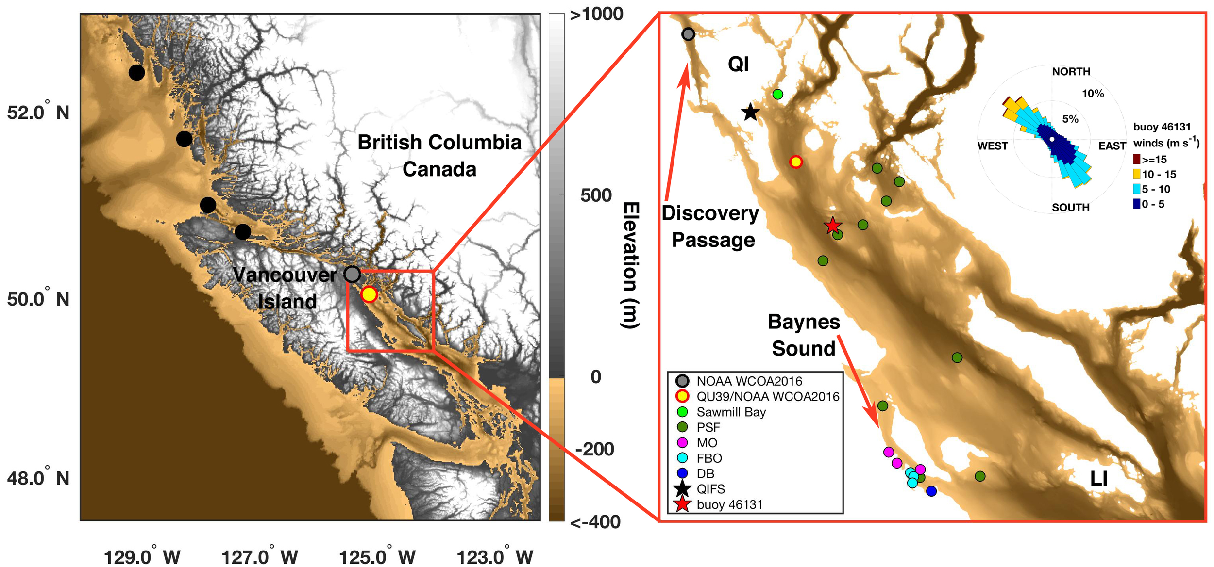 Sampling locations on the British Columbia (BC) coast (left) and in the Northern Salish Sea (NSS; red box in left and right). (Left) Shows locations occupied during the NOAA West Coast Ocean Acidification Cruise (WCOA2016) on the BC central coast (black), in Discovery Passage (gray), and in the NSS (red-outlined yellow circle). (Right) Shows locations in the NSS, defined here as waters extending from Quadra Island (QI) to Lasqueti Island (LI). The black star marks the Quadra Island Field Station (QIFS), and the red star marks Environment Canada weather buoy 46131. The Hakai Institute routinely samples the NSS station occupied during the NOAA WCOA2016 cruise (known as QU39). Additional sites were occupied by citizen science groups: light green dot = Sawmill Bay Shellfish Company, dark green dots = Pacific Salmon Foundation Citizen Science Program (PSF), magenta dots = Mac’s Oysters, Ltd. (MO), light blue dots = Fanny Bay Oysters (FBO), and dark blue dot = Vancouver Island University Deep Bay Field Station(DB). The wind rose in the right panel is hourly data from buoy 46131 collected between August 1997 to September 2018. Elevation shown in the left panel is from the Strait of Juan de Fuca 36 arc-second MHW Coastal Digital Elevation Model (https://data.noaa.gov/metaview/page?xml=NOAA/NESDIS/NGDC/MGG/DEM/iso/xml/541.xml&view=getDataView&header=none#Credit), and depth below sea surface in the right panel is from the British Columbia 3 arc-second Bathymetric Digital Elevation Model (https://data.noaa.gov/metaview/page?xml=NOAA/NESDIS/NGDC/MGG/DEM/iso/xml/4956.xml&view=getDataView&header=none). The color scale for depth below sea surface is the same between the two panels.