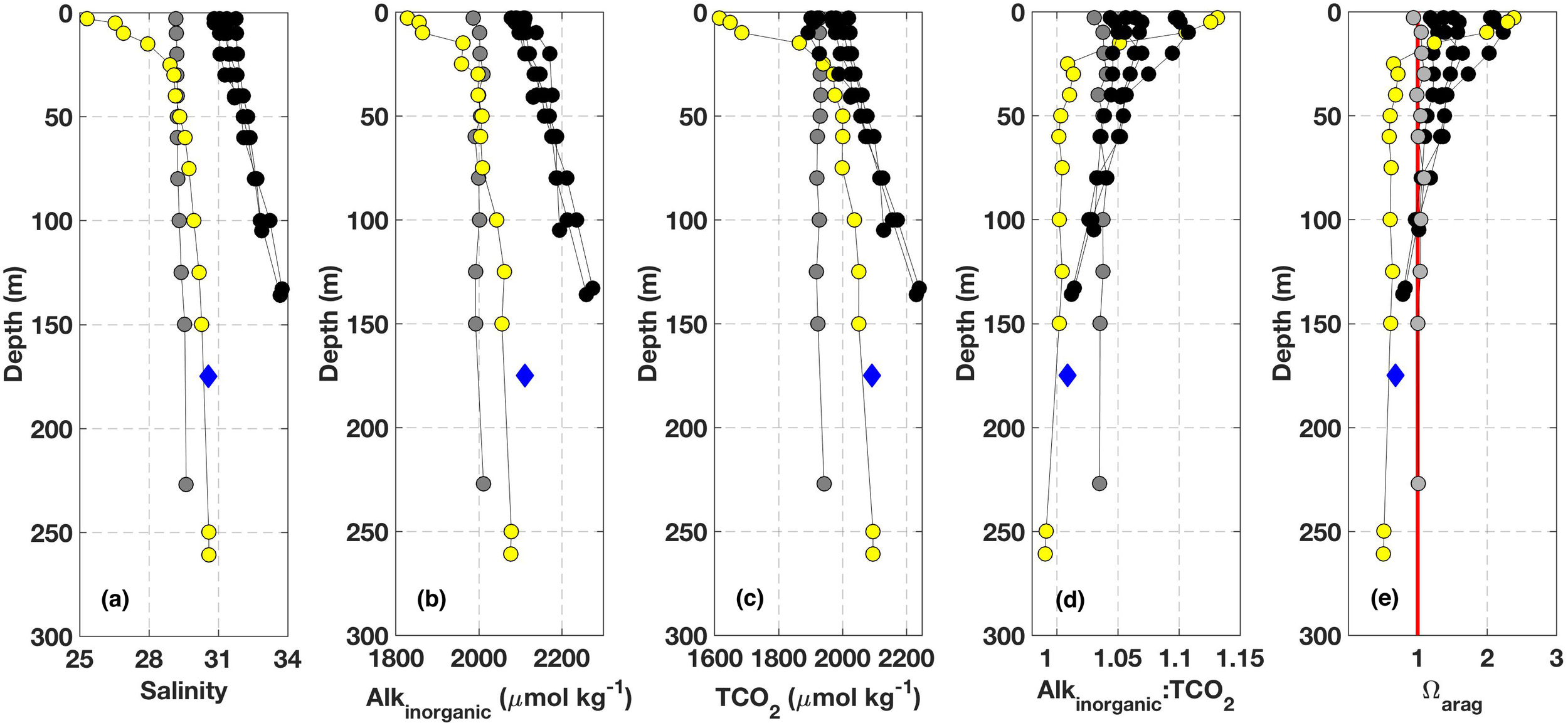 Observations from the NOAA WCOA2016 cruise in June 2016 color-coded by area as shown in Figure 1: data from the BC open continental shelf are black, the data from Discovery Passage are gray, and data from the NSS (QU39) are yellow. The data shown are: (A) salinity, (B) Alkinorganic (μmol kg-1), (C) TCO2 (μmol kg-1), (D) Alkinorganic:TCO2, and (E) Ωarag. The vertical red line in (E) marks Ωarag = 1. Also shown are averages from seasonally resolved data collected at station QU39 from depths ≥ 150 m between January 2016 and December 2017 (blue diamonds; n = 206). The deep-water averages (±standard deviation) for salinity, Alkinorganic, TCO2, Alkinorganic:TCO2, and Ωarag were 30.58 ± 0.25, 2112 ± 24 μmol kg-1, 2093 ± 31 μmol kg-1, 1.009 ± 0.008, and 0.68 ± 0.09, respectively.