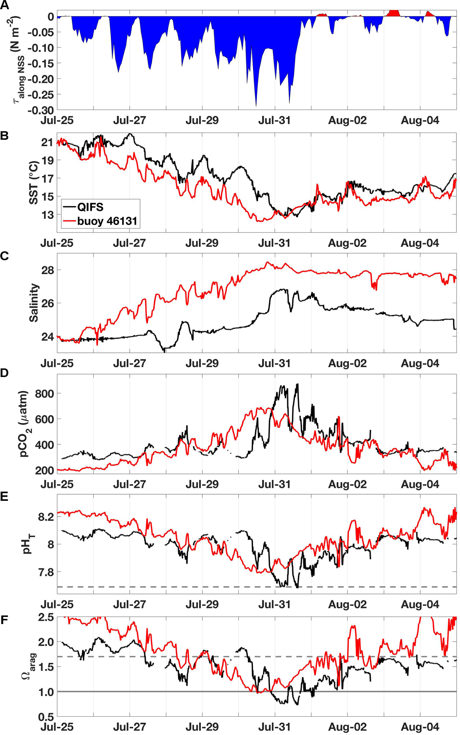 Observations made during the July 2016 high-CO2 event, including: (A) along-axis wind stress (τalong NSS; N m-2) from buoy 46131, (B) SST (°C) from QIFS and buoy 46131, (C) salinity from QIFS and buoy 46131, (D) seawater pCO2 (μatm) from QIFS and buoy 46131, (E) pHT from QIFS and buoy 46131, and (F) Ωarag from QIFS and buoy 46131. All QIFS data are black while buoy 46131 data are red. The horizontal line in (E) marks pHT = 7.69, and the horizontal lines in (F) mark Ωarag = 1 (solid gray) and Ωarag = 1.7 (dashed gray).