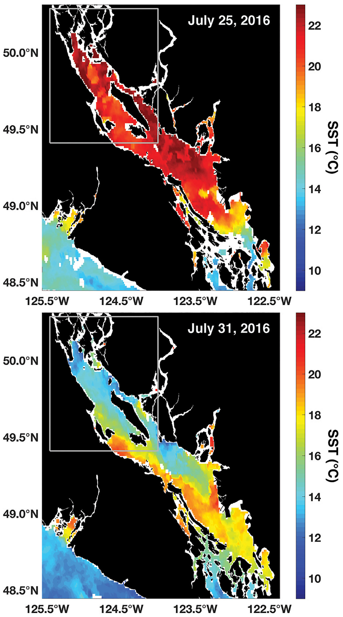 NOAA Polar Operational Environmental Satellite (POES) Advanced Very High Resolution Radiometer (AVHRR) daily average (night and day passes) 1.1 km SST (°C) at the start (top) and peak (bottom) of the July 2016 high-CO2 event. The gray box marks the NSS as outlined in Figure 1.