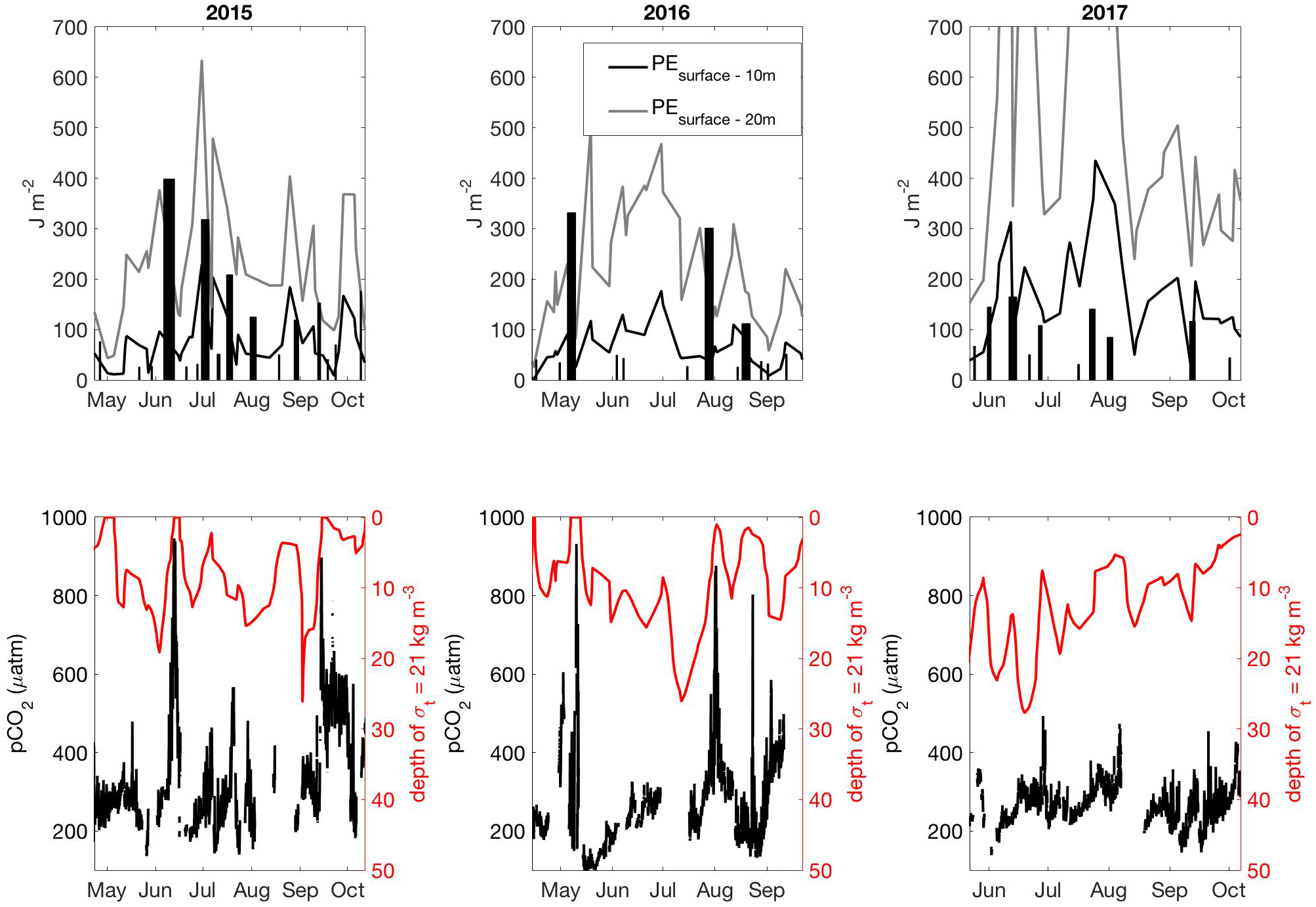 Top row is the integrated rate of energy transfer (J m-2; bars) over the duration of wind events observed between the spring and fall transitions (Supplementary Figure S5) in 2015 (left), 2016 (middle), and 2017 (right). The width of the bars equates to the duration of the wind event. The top panels also show the potential energy needed to mix the upper water column (surface to 10 m in black, surface to 20 m in gray). Lower panel is surface water pCO2 from QIFS (black) and the depth of the 21 kg m-3 density anomaly (σt) surface.