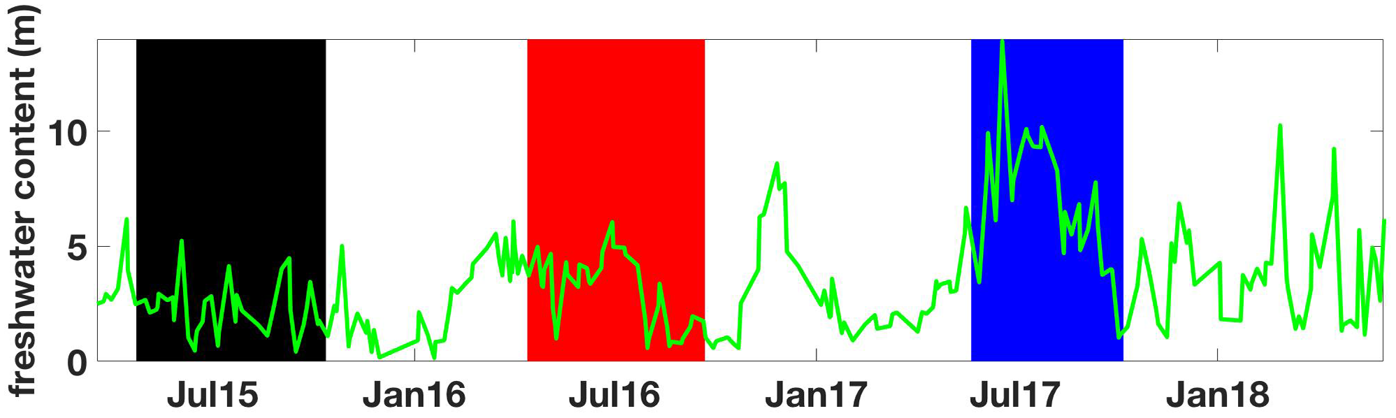 Freshwater content at QU39 from March 18, 2015 to June 1, 2018 computed using a reference salinity of 29.1 following the relationship from Proshutinsky et al. (2009). Vertical shaded areas mark the time periods between spring and fall transitions color-coded to match the years shown in Supplementary Figures S5, S6.