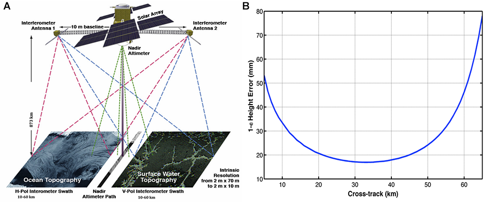 (A) Schematic of the SWOT measurement technique using the KaRIn instrument for SAR-interferometry over the two swaths, and a Jason-class nadir altimeter in the gap. (B) The standard deviation of the ocean height error performance at 1 km × 1 km due to all the random errors (in mm) as a function of distance across the swath for a 2-m significant wave height. The swath-averaged (10 to 60 km) height error is 2.4 cm (Credits: NASA-JPL).