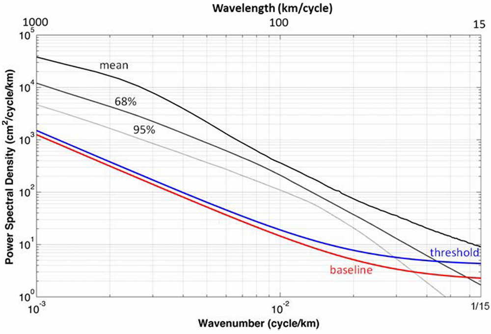 SSH baseline requirement spectrum (red curve) as a function of wavenumber represented by an empirical function, E(k) = 2 + 0.00125 k-2, where k represents along-track wavenumber. The blue curve is the threshold requirement. Shown for reference is the global mean SSH spectrum estimated from the Jason-1 and Jason-2 observations (thick black line), the lower boundary of 68% of the spectral values (the thin black line), and the lower boundary of 95% of the spectral values (the gray line). The blue and red lines represent a swath-average performance, and intersect the baseline spectrum at ∼15 km (68%) and ∼30 km (95%), respectively (Desai, 2018; Credits: NASA-JPL).