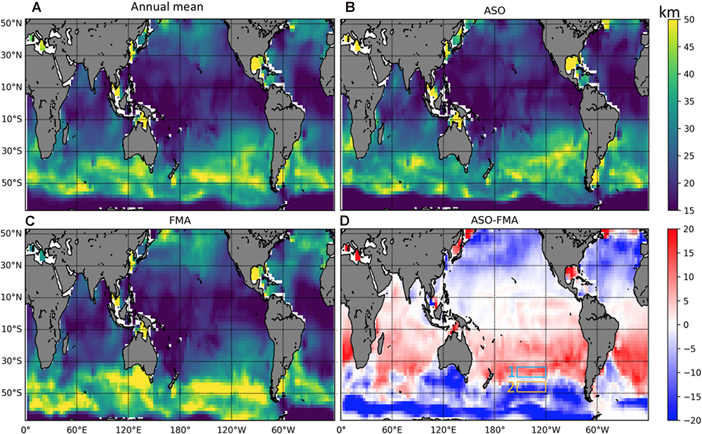 SWOT effective spatial resolution (signal above noise) estimated from a model and simulated noise (A) averaged annually, (B) in August–September–October (ASO), (C) in February–March–April (FMA). The seasonal change (ASO-FMA) is shown in (D) (after Wang et al., 2019; copyright 2019, American Meteorological Society).