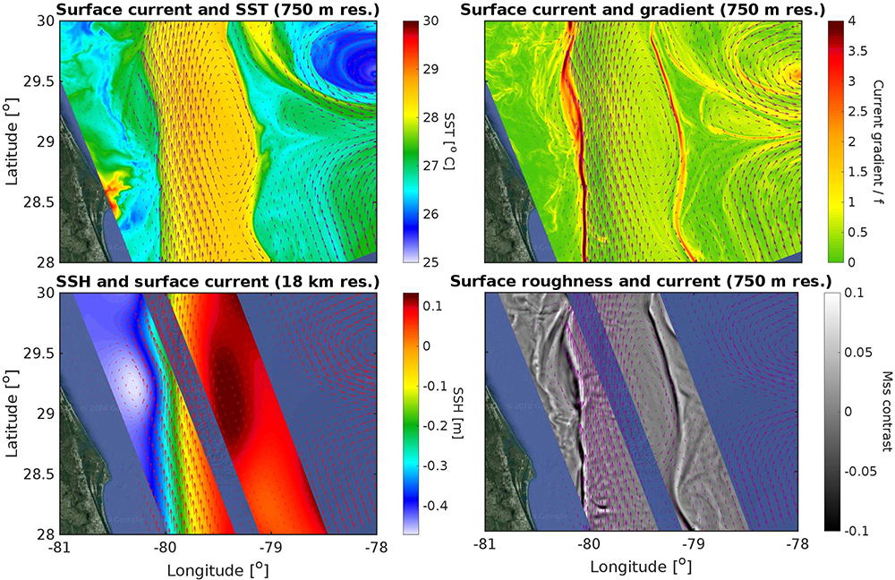 Satellite optical and radar measurements often reveal sea surface roughness changes at sub-kilometer scales, mostly under low to moderate wind conditions (e.g., Alpers, 1985; Yoder et al., 1994). These surface roughness changes can be traced by surface current gradients, related to internal waves and/or surfactant lines created by surface velocity convergences. They typically occur with sharp gradients of temperature and/or ocean color. Efforts have been made to interpret surface roughness gradients quantitatively (e.g., Kudryavtsev et al., 2014; Rascle et al., 2016, 2017). They confirm that horizontal convergence and shear estimated from in situ drifters are generally consistent with the theoretical wave action equation (e.g., Kudryavtsev et al., 2005, 2012). This equation predicts how current gradients influence the amplitude of short gravity waves that propagate in different directions, from which a surface optical reflectance or radar cross section can be estimated. When several viewing angles are available, optical or radar measurements can be inverted to yield both the amplitude and direction of the surface current gradient.