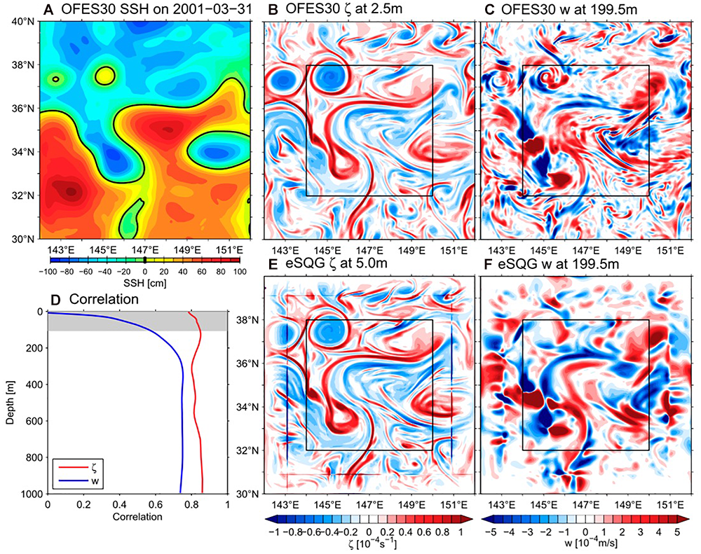 (A) Numerical simulation sea level on March 31, 2001. (B) Relative vorticity at 2.5 m and (C) vertical velocity w at 199.5 m from the numerical simulation. (E) Relative vorticity at 5.0 m and (F) w at 199.5 m reconstructed based on sea level according to effective SQG. (D) Linear correlation coefficients for relative vorticity (red line) and w (blue line) between the original and reconstructed fields as a function of depth. Gray shade denotes the mixed layer depth averaged in the reconstruction region of 32°–38°N and 144°–150°E (see Qiu et al., 2016 for details; copyright 2016, American Meteorological Society).