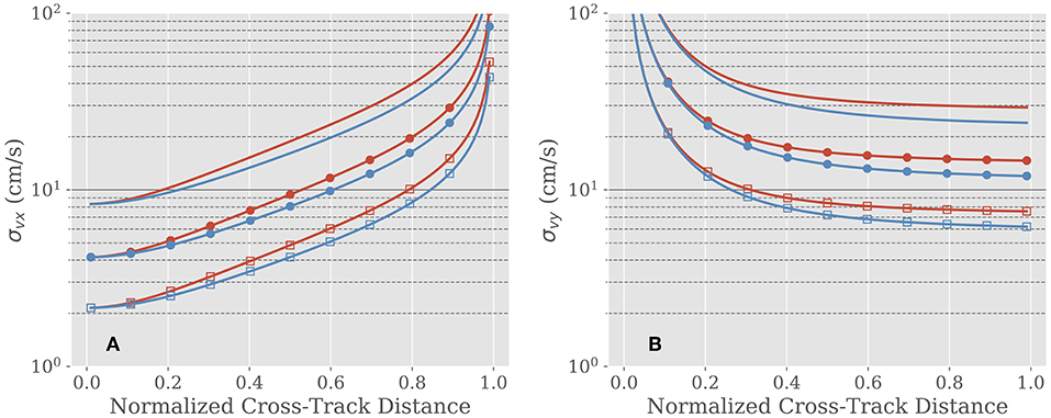 Figure 2. Velocity component error as a function of the normalized cross-track distance from nadir in the (A) along-track (σvx) direction (roughly North) and (B) across-track (σvy) direction (roughly East),for antenna lengths of 4 m (read), and 5 m (blue). The peak output power is 100 Watts (solid line), 400 Watts (circles), and 1.5 kWatts (squares). From Rodriguez (2018).