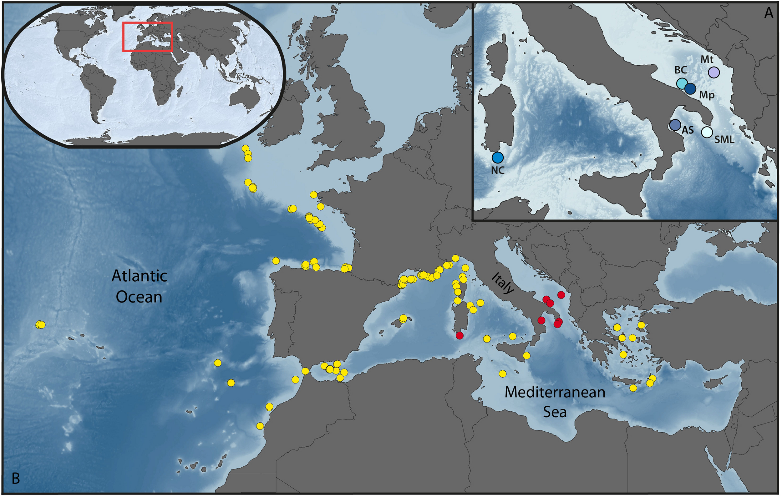 Dendrophyllia cornigera distribution. (A) Detailed view of the sites explored by the ROV dives. BC, Bari Canyon (272–510 m depth); SML, off Santa Maria di Leuca (119–498 m depth); AS, Amendolara Seamount (133–205 m depth); NC, Nora Canyon (441–463 m depth); Mt, off Montenegro (433–504 m depth); Mp, off Monopoli (463–494 m depth). (B) Locations of D. cornigera published records (yellow dots, for reference see Supplementary Table S1), and occurrences obtained from ROV video transects (red dots).
