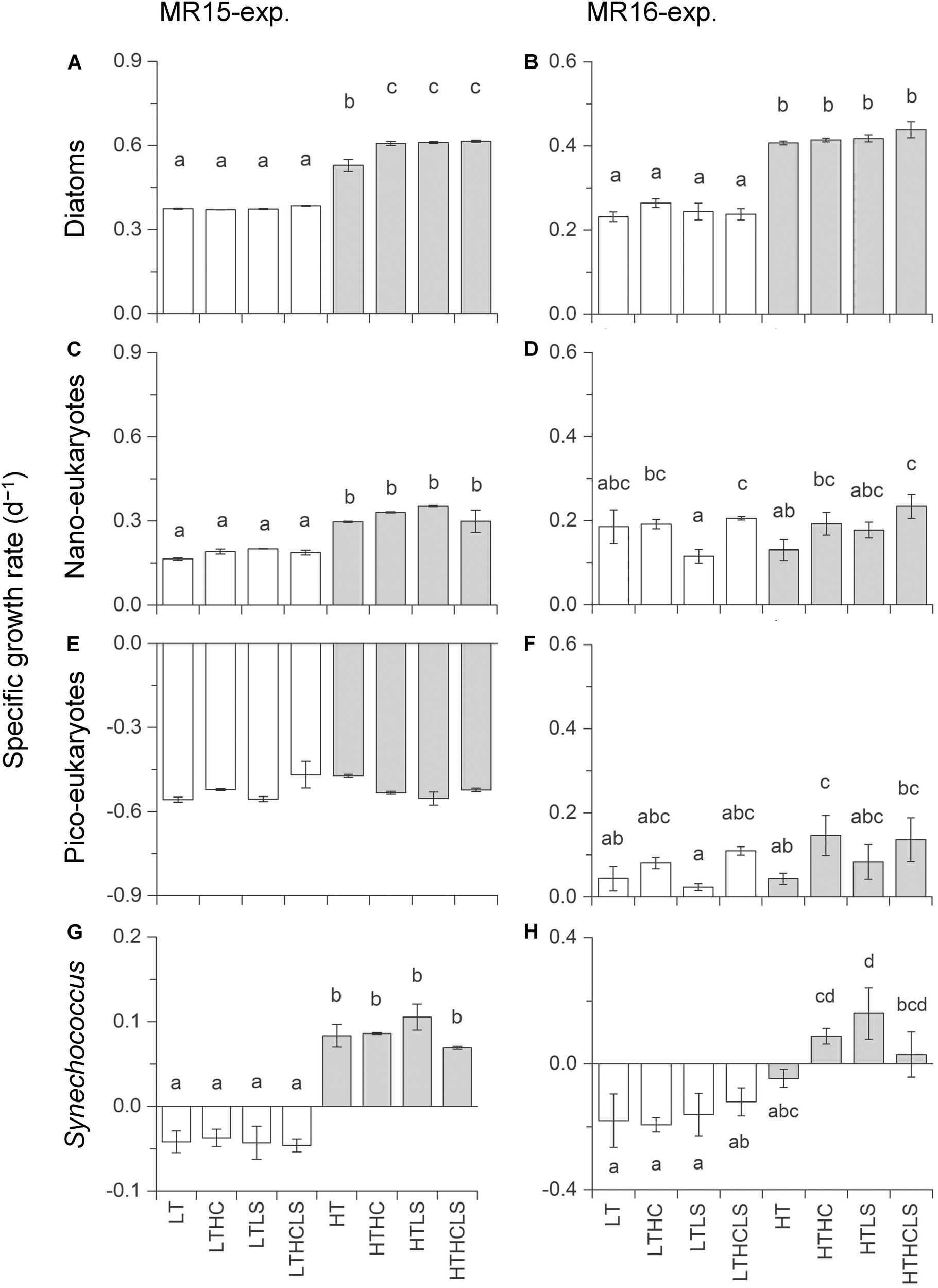 Specific growth rates based on chlorophyll-a concentrations during the exponential growth phase. Left and right panels represent the MR15-exp. and the MR16-exp., respectively. (A,B) total chl-a, (C,D) >10 μm size fraction, and (E,F) <10 μm sized fraction. Letters above the bars represent statistical results of groups according to the Tukey–Kramer test.