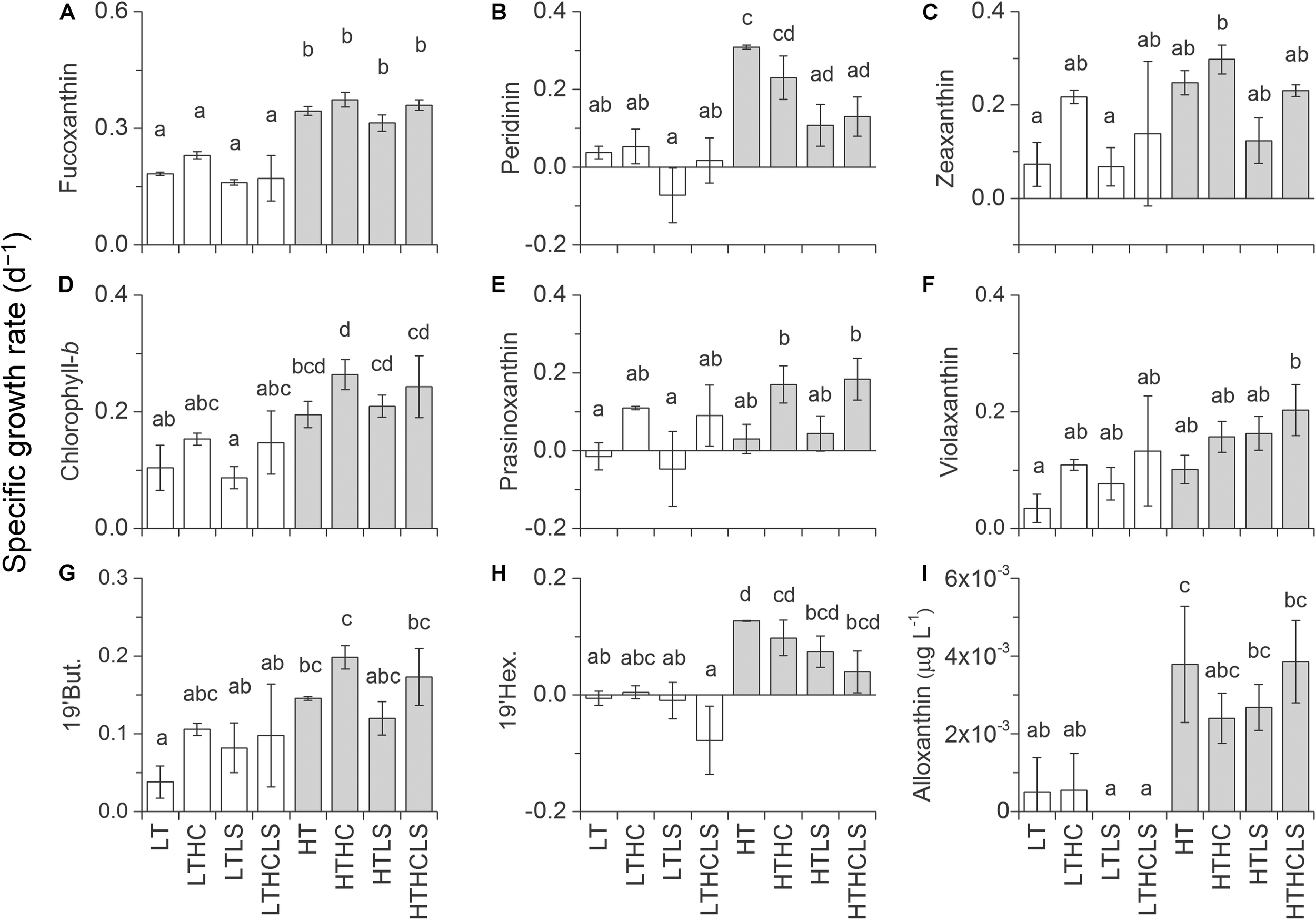 N.S., not significant. Abbreviations: Chl-a, Chlorophyll-a; Nano-E, nano-sized eukaryotic phytoplankton; Pico-E, pico-sized eukaryotic phytoplankton; Ch., Chaetoceros; Th., Thalassiosira; Ps., Pseudo-mtzschia; 19′But., 19′-buanoiloxifucoxanthin; Chl-b, chlorophyll-b; 19′Hex., 19′-hexanoiloxifucoxanthin: N.S., not significant. ∗Alloxanthin in MR16-exp. we analyzed using concentration data at the end of incubation (day 6 and 7 for LT and HT series, respectively). We could not estimate specific growth rate properly due to extremely low concentration in days 2 or 3.
