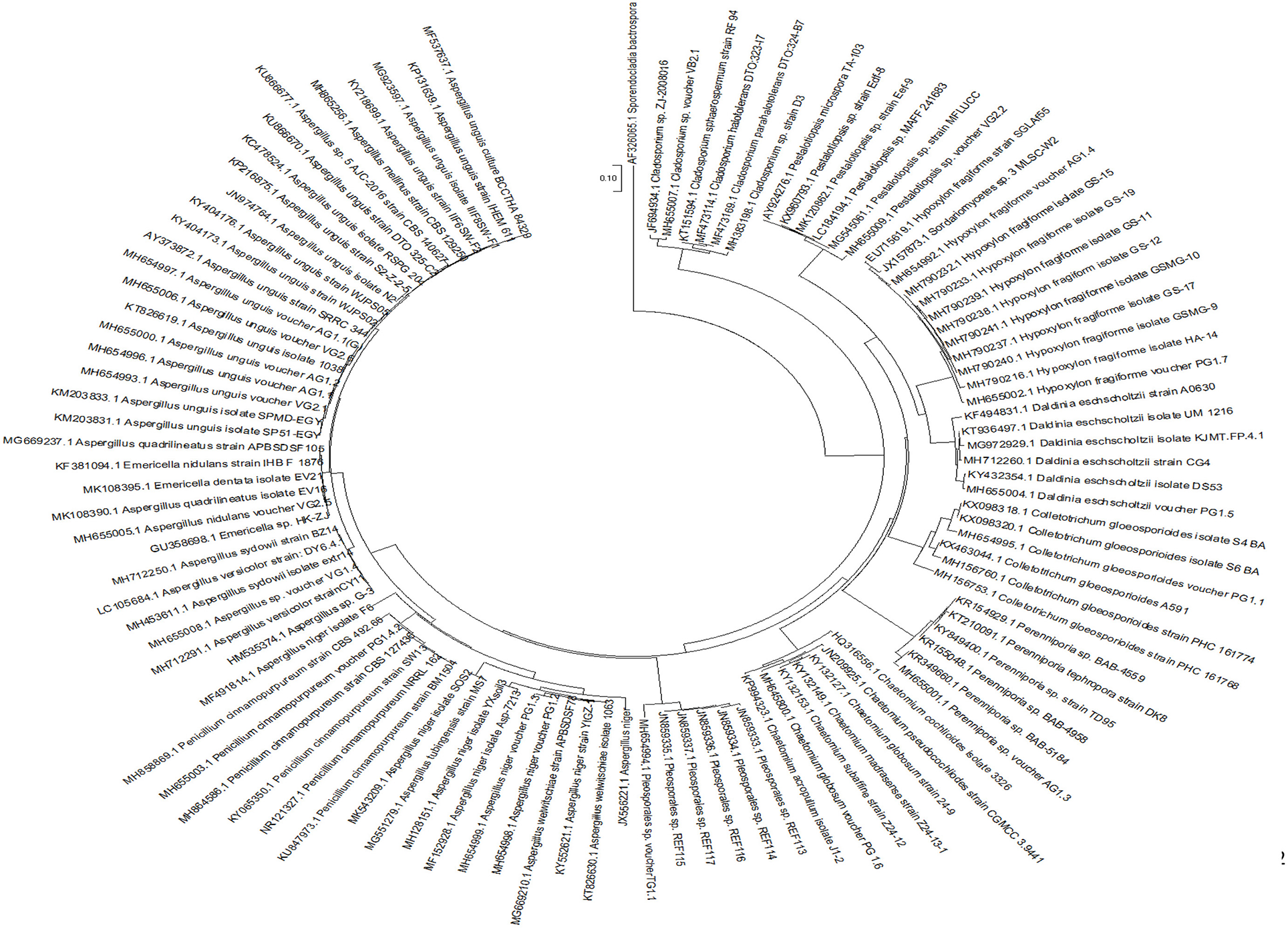 For construction of the phylogenetic tree, ITS sequences of the endophytic fungi and their nearest neighbors from NCBI were aligned using ClustalW in MEGA-X. UPGMA method was used to build the tree. Evolutionary history was inferred by the Neighbor-Joining method and the evolutionary distances were computed using Maximum Composite Likelihood method. The anamorphic fungus Sporendocladia bactrospora of the family Ceratocystidaceae was used as an outgroup species.