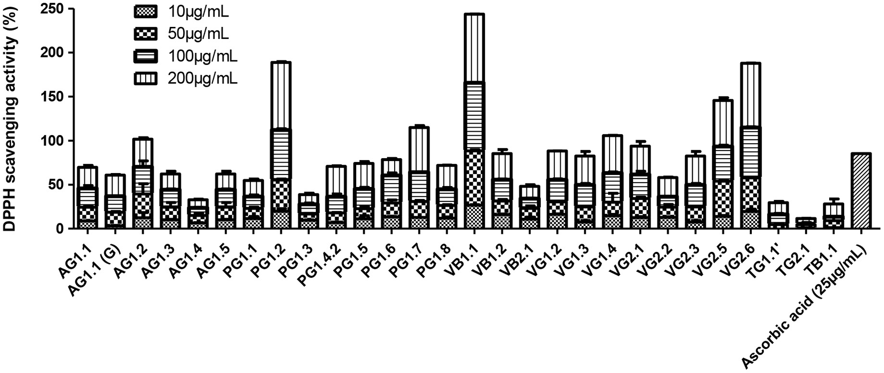 The maximum antioxidative activity was shown by VB1.1 followed by PG1.2 and VG2.6 in a concentration-dependent manner (Figure 3). The DPPH scavenging activity of VB1.1 was comparable to the scavenging activity of ascorbic acid. Endophytic fungi isolated from marine algae are the hot spot for the synthesis of a myriad of bioactive compounds. Earlier, Li et al. (2017) extracted antioxidant hydroanthraquinones from the marine algal-derived endophytic fungus Talaromyces islandicus EN-501.